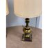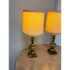 Design Plus Gallery presents a Pair of Brass Table Lamps in the Style of the Mid 20th Century Brand Stiffel. The pair have identical and original linen shades that have gold brands at the top and base. Both are in good condition with minimal wear for their usage.