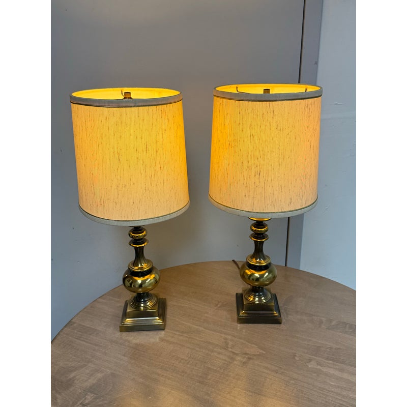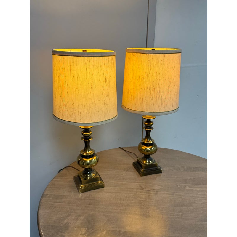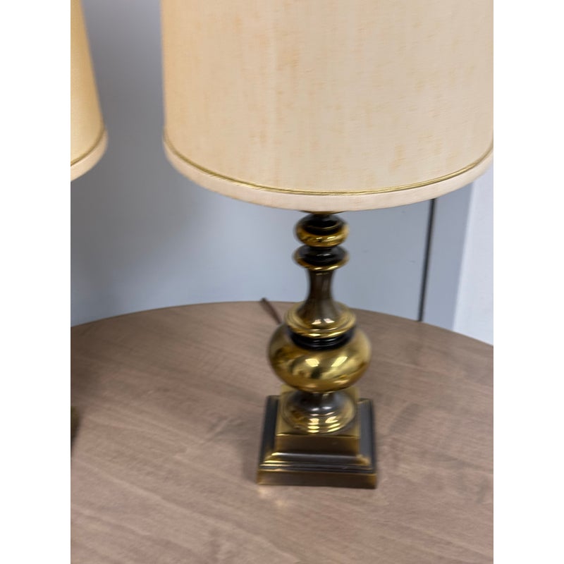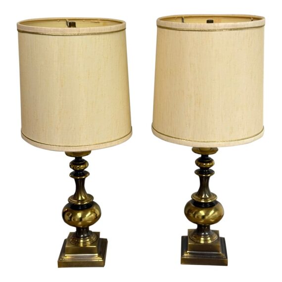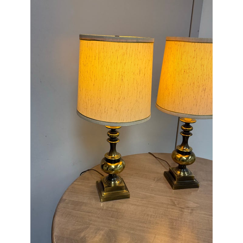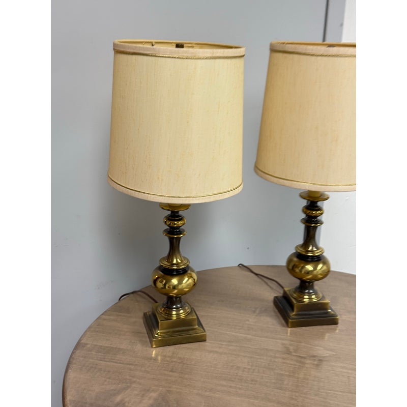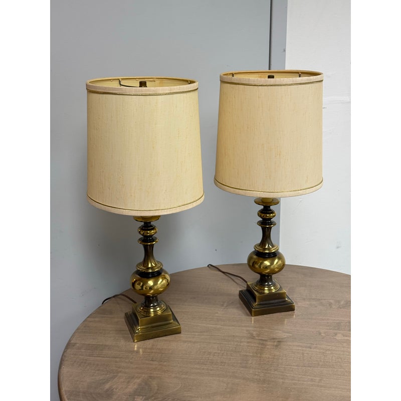 Design Plus Gallery presents a Pair of Brass Table Lamps in the Style of the Mid 20th Century Brand Stiffel. The pair have identical and original linen shades that have gold brands at the top and base. Both are in good condition with minimal wear for their usage.