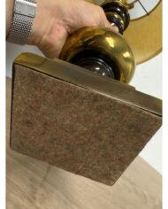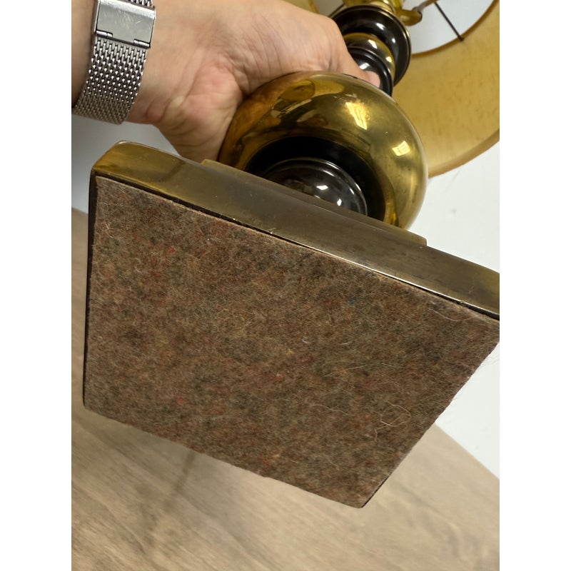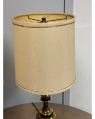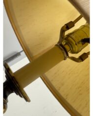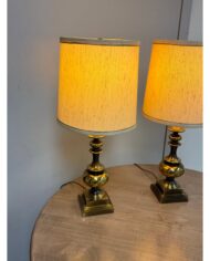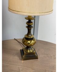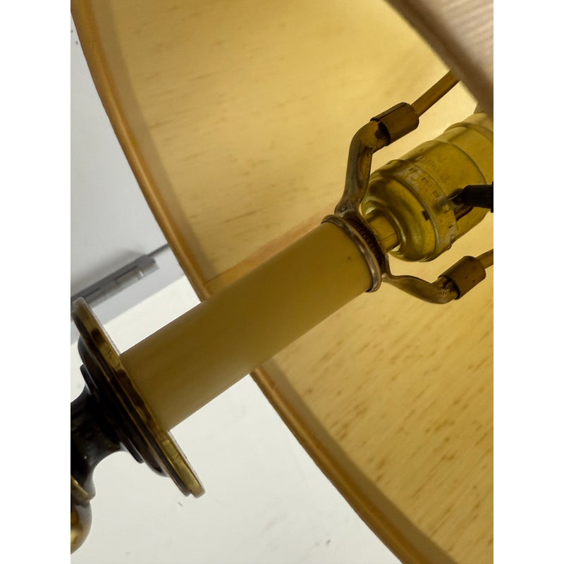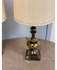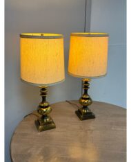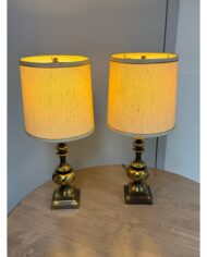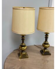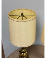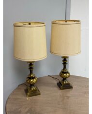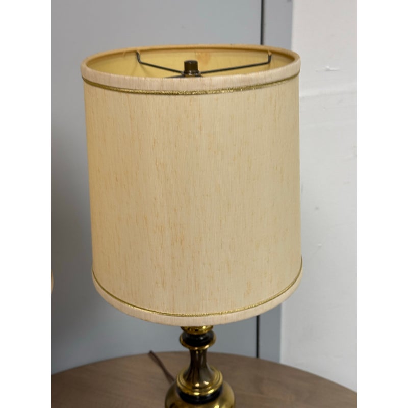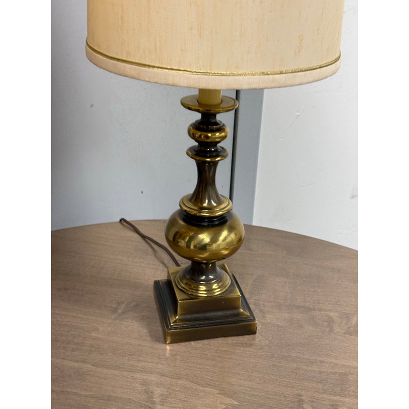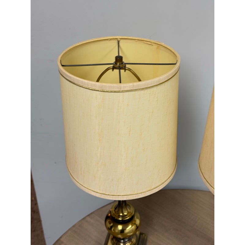 Design Plus Gallery presents a Pair of Brass Table Lamps in the Style of the Mid 20th Century Brand Stiffel. The pair have identical and original linen shades that have gold brands at the top and base. Both are in good condition with minimal wear for their usage.