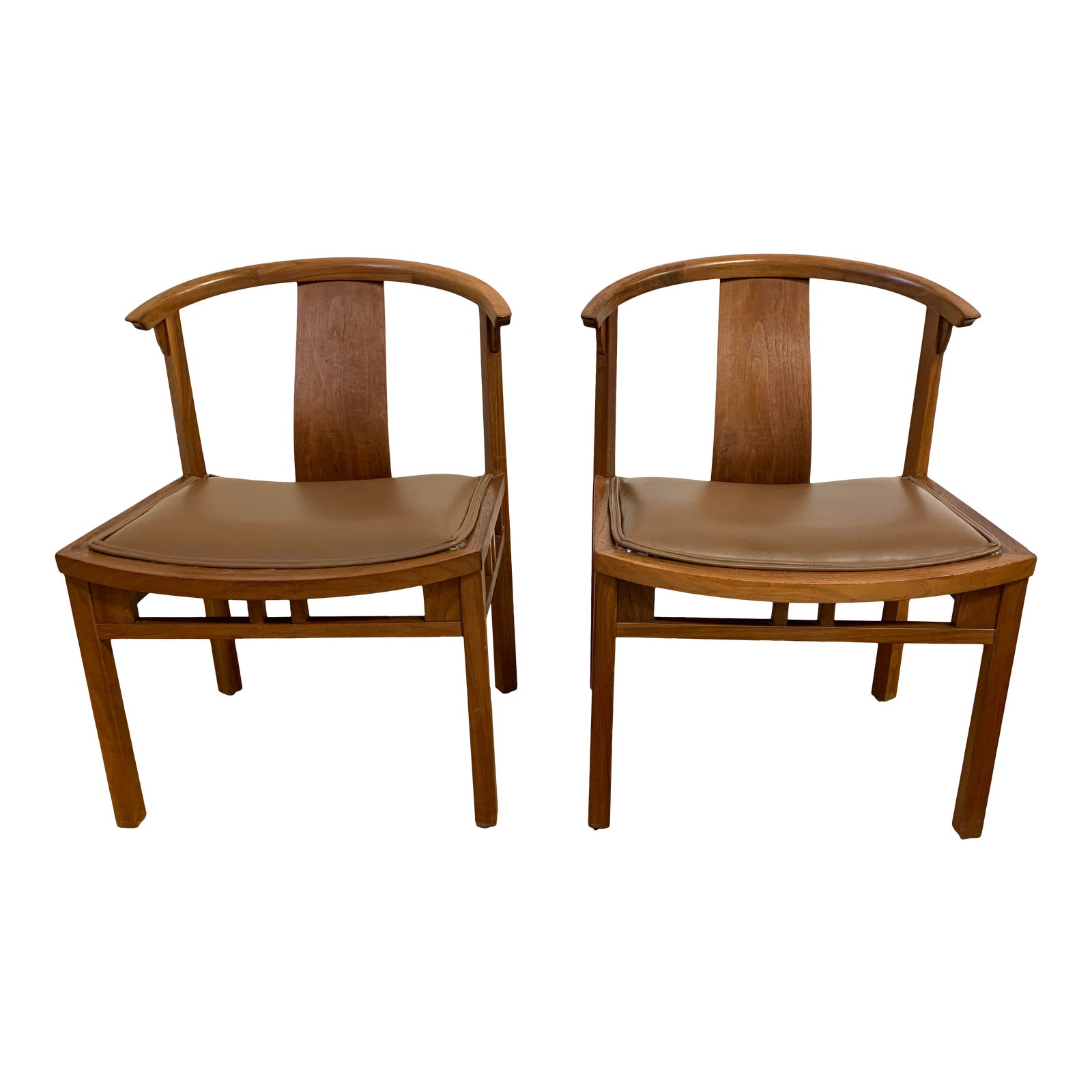 Design Plus Gallery presents Pair of Asian Mid 20th-Century Style Wood + Bonded Leather Chairs. Horse Shoe back adds a nice low curvature to any space. Handcrafted from solid woods with a warm finish and buttery leather. Ideal in a window alcove or floating in a space with an open space plan. Leather welt is loose on one of the seats (pictured.)