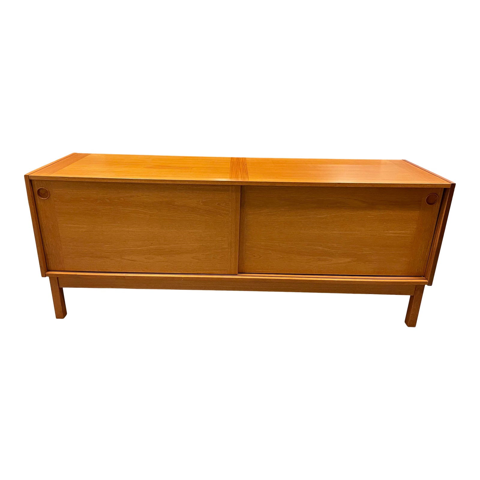 Design Plus Gallery presents a Late 20th Century Teak Credenza. Teak veneers with particle board make up the construction of this large open storage unit and gives plenty of space on top for creating a moment. Back panel has been altered to accommodate electrical cording. Interior is missing the original shelf and there has been a repair made to one of the sides. Multi purpose unit can serve media, office or bedroom needs easily. Teak adds a warmth + modern organic touch to any space. Sliding panels allow for easier access in smaller spaces without door swings opening into high traffic areas.