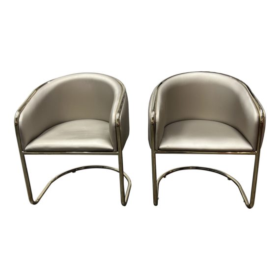 Design Plus Gallery presents a Pair of Mid-20th Century Thonet Style Barrel Chairs. The chairs are upholstered in a soft silver tone synthetic fabric that has a slight sheen. The legs are metallic with chrome finish. They are very comfortable, they look great from the back and would shine in any room. Visible wear on seating. Minor wear from use; chairs are in good condition.