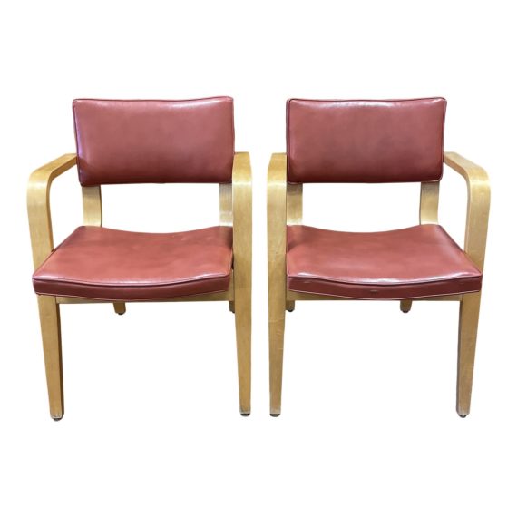 Design Plus Gallery presents a Pair of Mid 20th-Century Thonet Style Maple Arm Chair. Honey tone of the maple frame is further complemented with a tipped brick red vinyl upholstery. Open mid century frame adds a fun inviting character to a dining or office space. Minor wear.