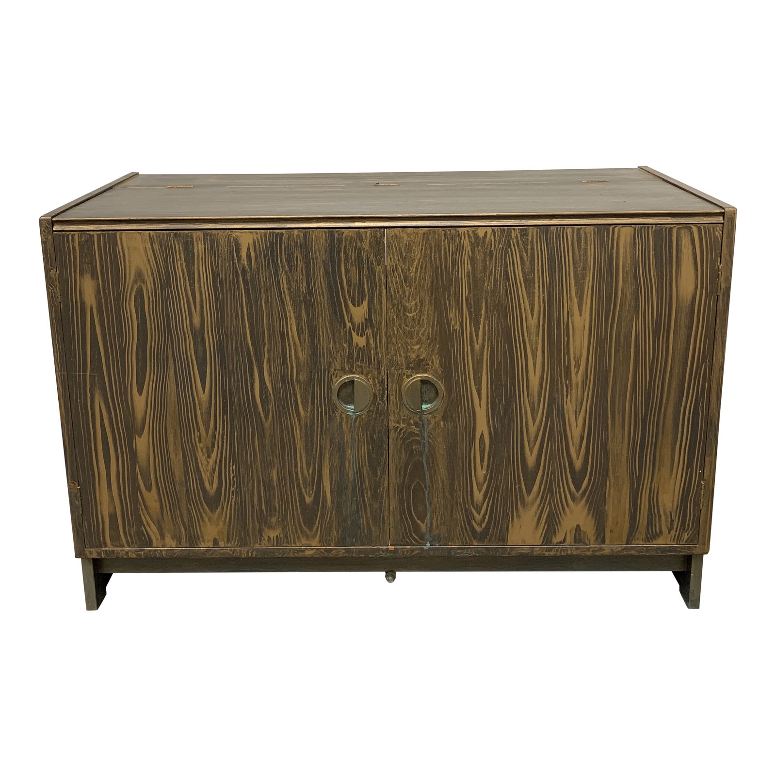 Design Plus Gallery presents a Mid-20th Century Turn Table Media Unit. Constructed from solid woods and veneers. Discoloration on frame due to age and sun exposure. Copper handles, wood grain + metal base have visible wear (pictured.) Internal shelving and cut outs have been optimized for a record table setup. Flip top makes for easy concealing and accessibility for playing your favorite vinyl. Complete with tidy electrical shelf on back of the unit for a power strip.