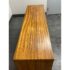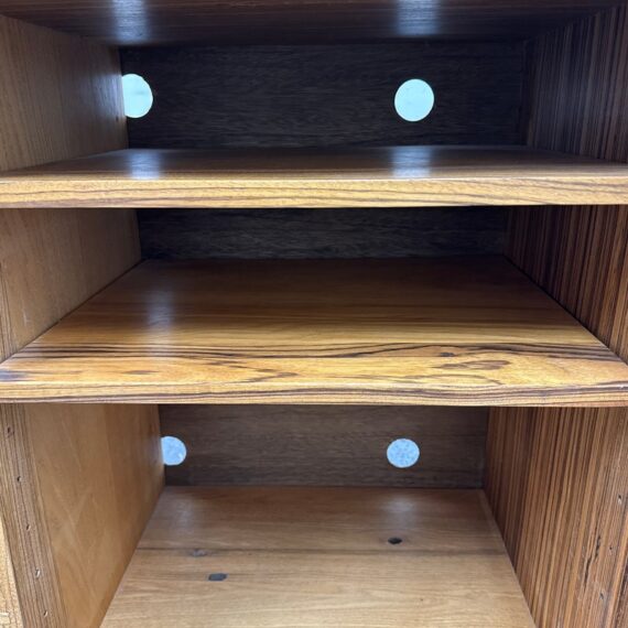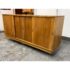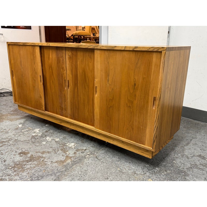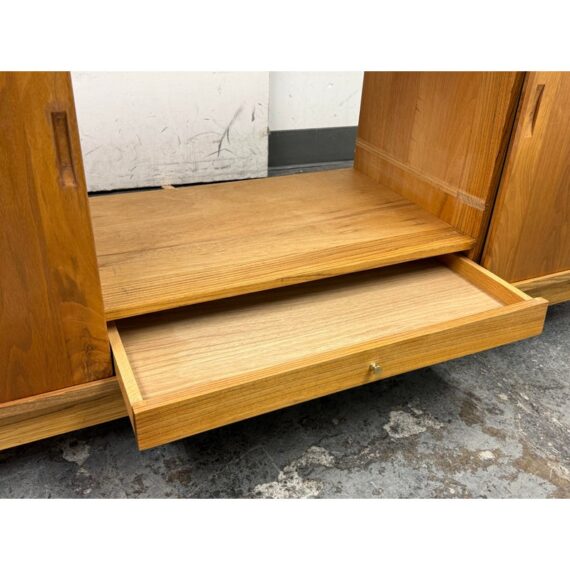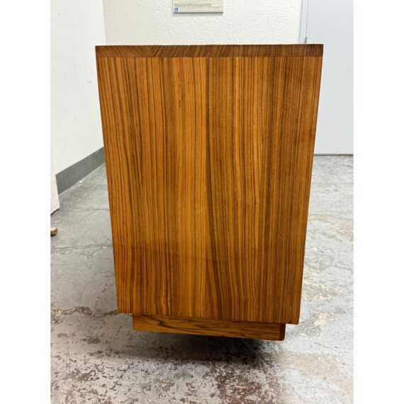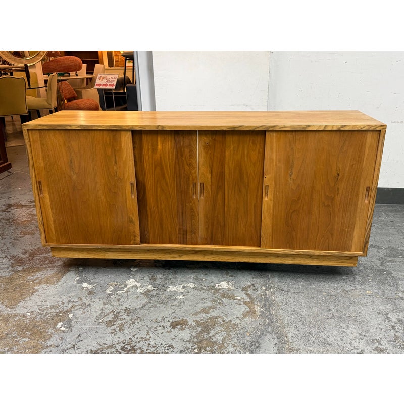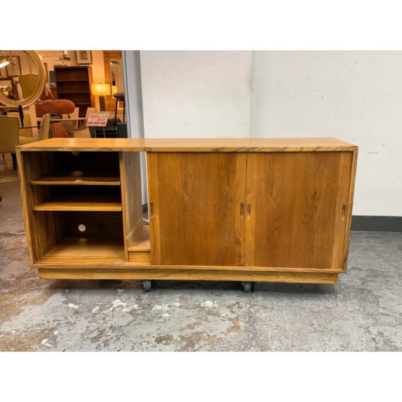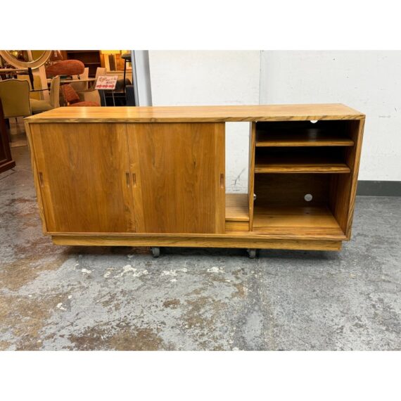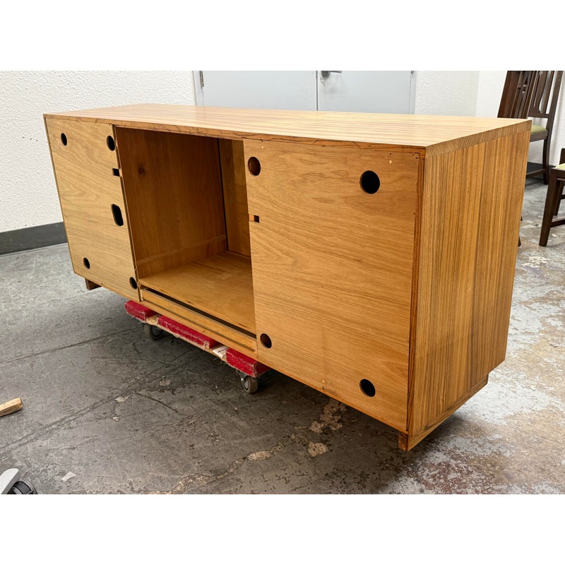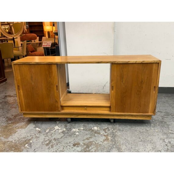Design Plus Gallery presents a Mid Century Modern Sideboard of Vintage Age. The style of this is timeless with plenty of uses, an adaptive addition to your home. There are three sliding doors with inset handles that open to reveal shelf space on either side or an open cavity in the center. There are holes for cord management on the backside and a sweet hidden drawer in the center base that has a shallow depth. A missing center back and missing center shelf. Visible wear is present and is considered to be in fair condition for its overall usage.