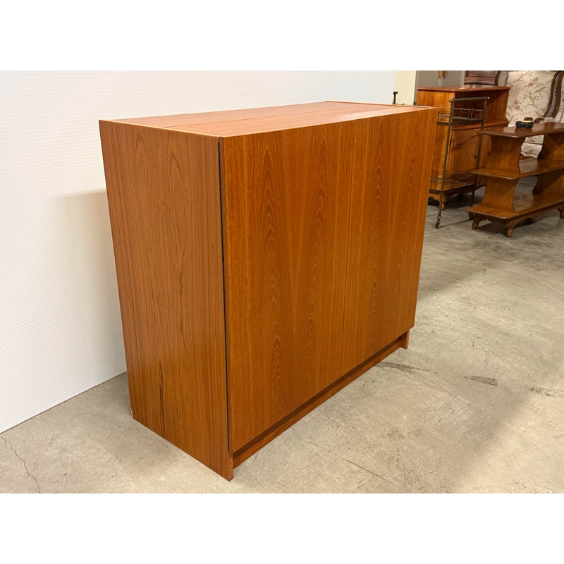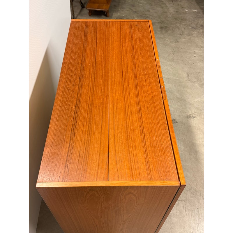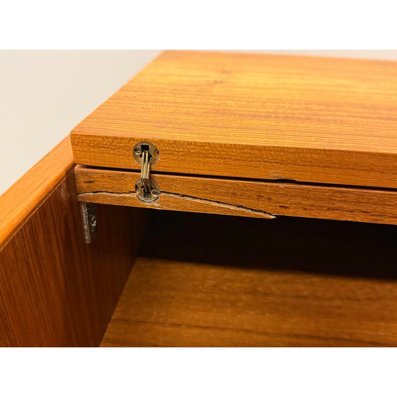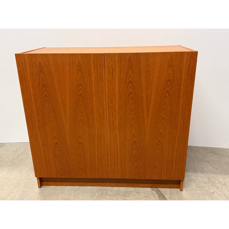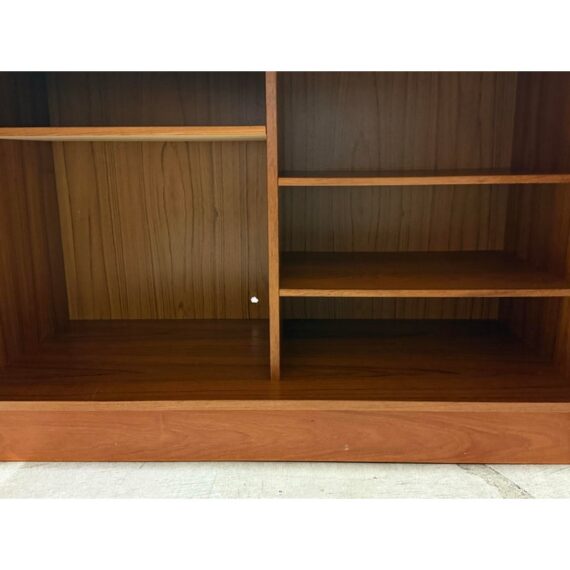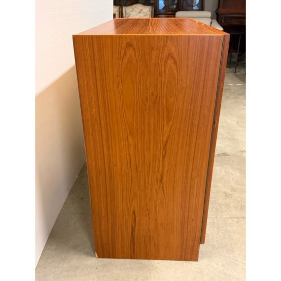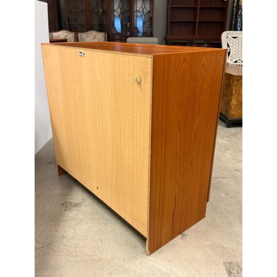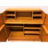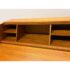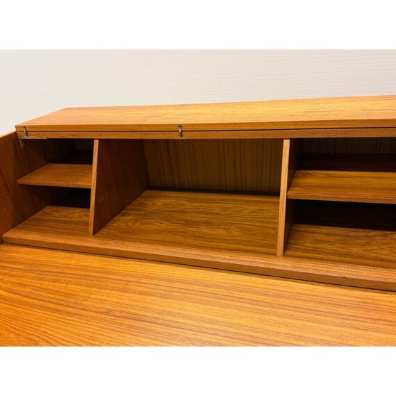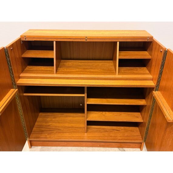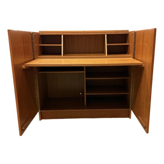Design Plus Gallery presents the “Magic Box”, a Hidden Teak Wood Desk from Vitré. This console is actually a remarkable design that is as modern today as at the time of its creation. The rectangular box shape silhouette opens up with doors to a pull out desk that is supported with flip down legs. The top flips back upon itself allowing access to multiple cubbies, above the work surface. Light surface wear; crack at top hinge, small cord access in back. Condition is consistent with age and use. Made in Denmark.