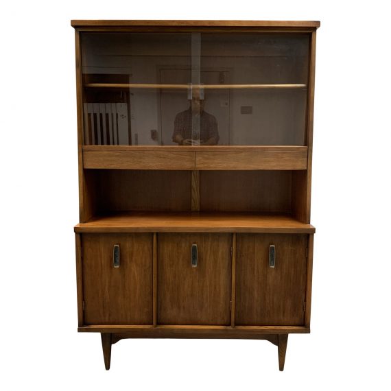 Design Plus Gallery presents a Mid-20th Century Hutch. Crafted from solid walnut woods and veneers. Two sliding glass doors with a single wood shelf. Two middle pullout drawers with three lower swing open doors. Minor wear.