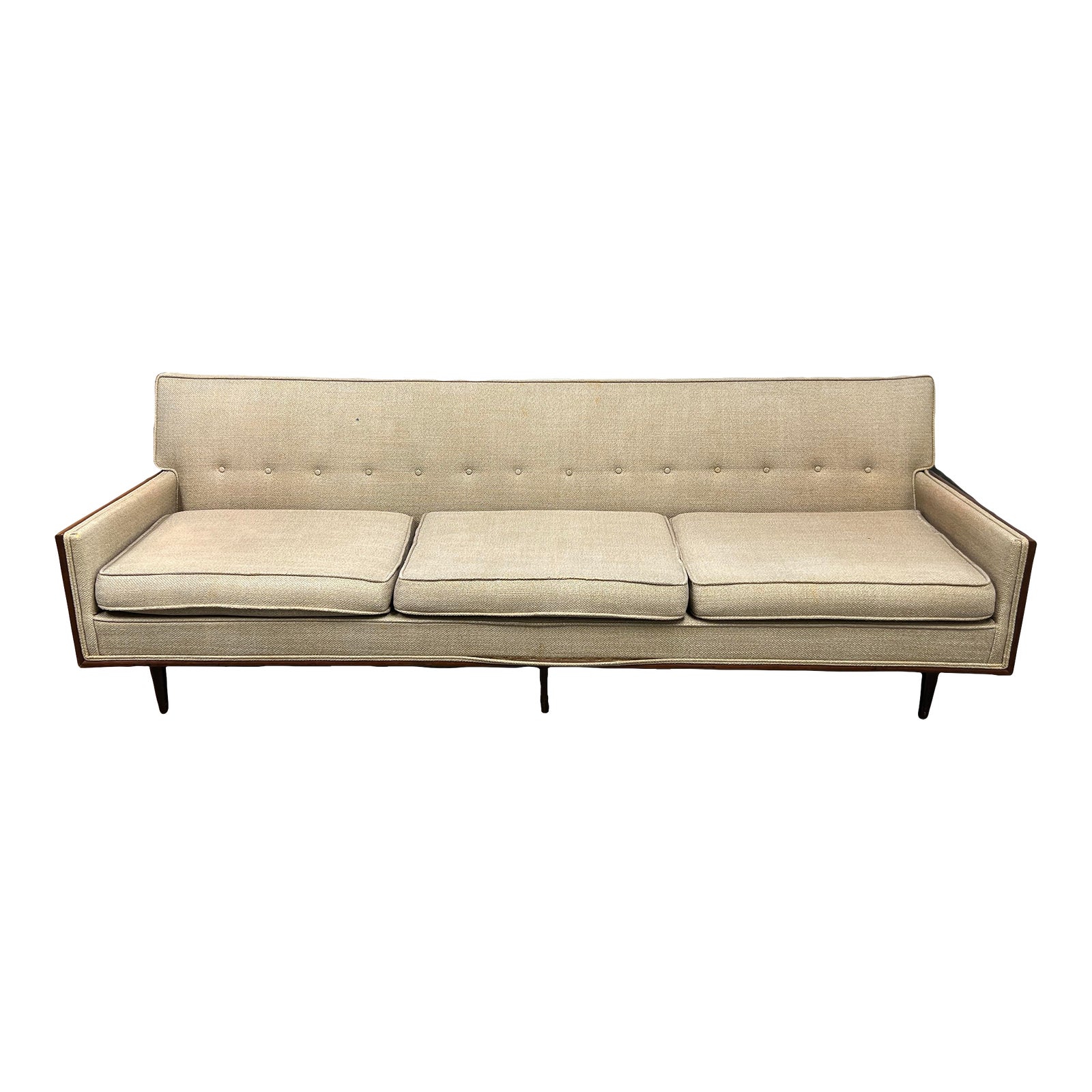 Design Plus Gallery presents a Mid 20th Century Wieland Furniture Sofa. Fixed button tufted back + a cool wood arm detail makes for a classic mid century modern lounging space. The frame was reupholstered in 2010, the fabric does show wear however. The welt is coming off the base and there is sun fading through out. Sofa would benefit from re-upholstery. Made in the USA.