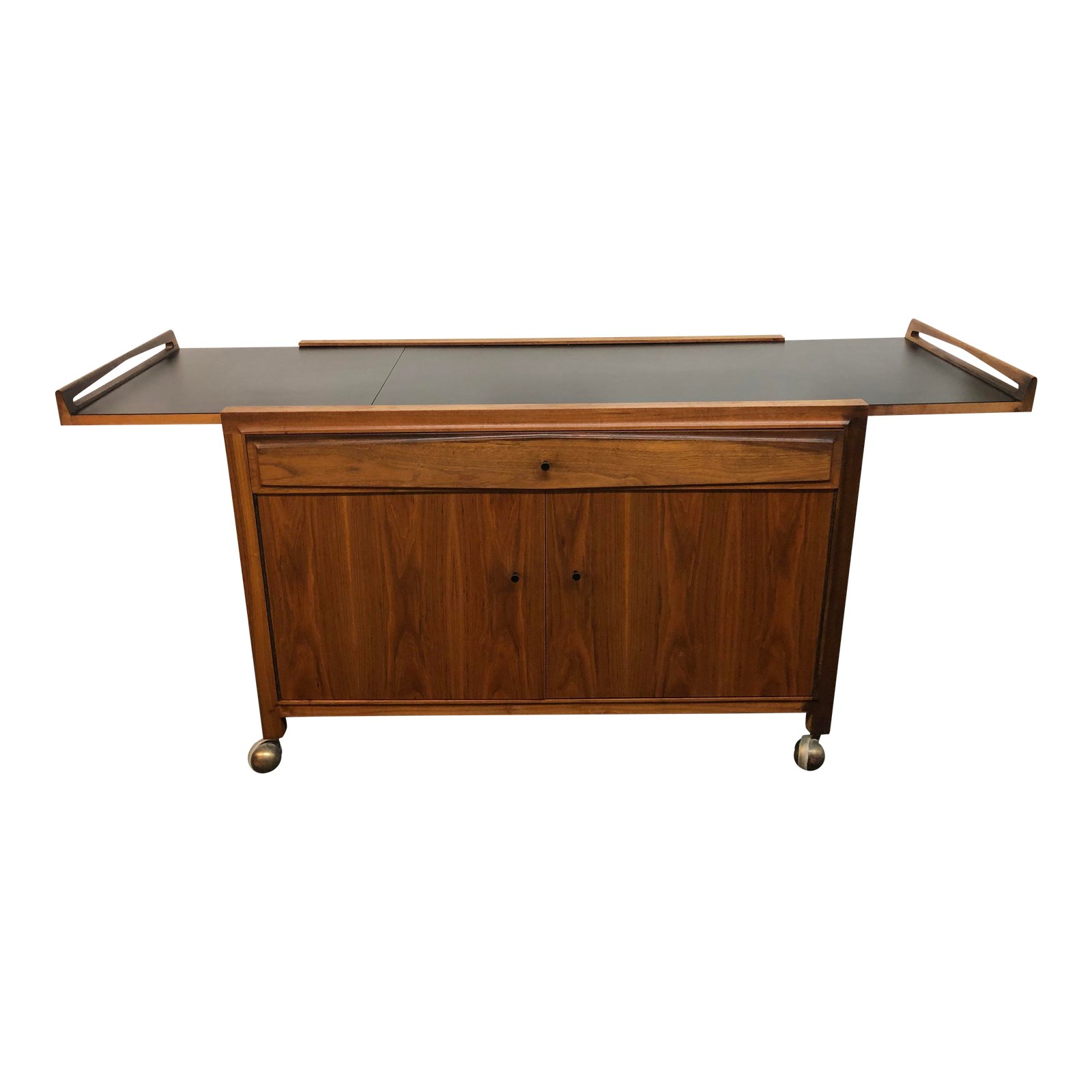Design Plus Gallery presents a beautiful and functional bar cart. Crafted by Glenn of Arcadia California, it has all the features one would expect from a mid-century gem. Exquisite walnut wood grain, brass casters, expanding laminate serving surface and drop-leaf and adjustable shelf and roomy drawer on the inside.