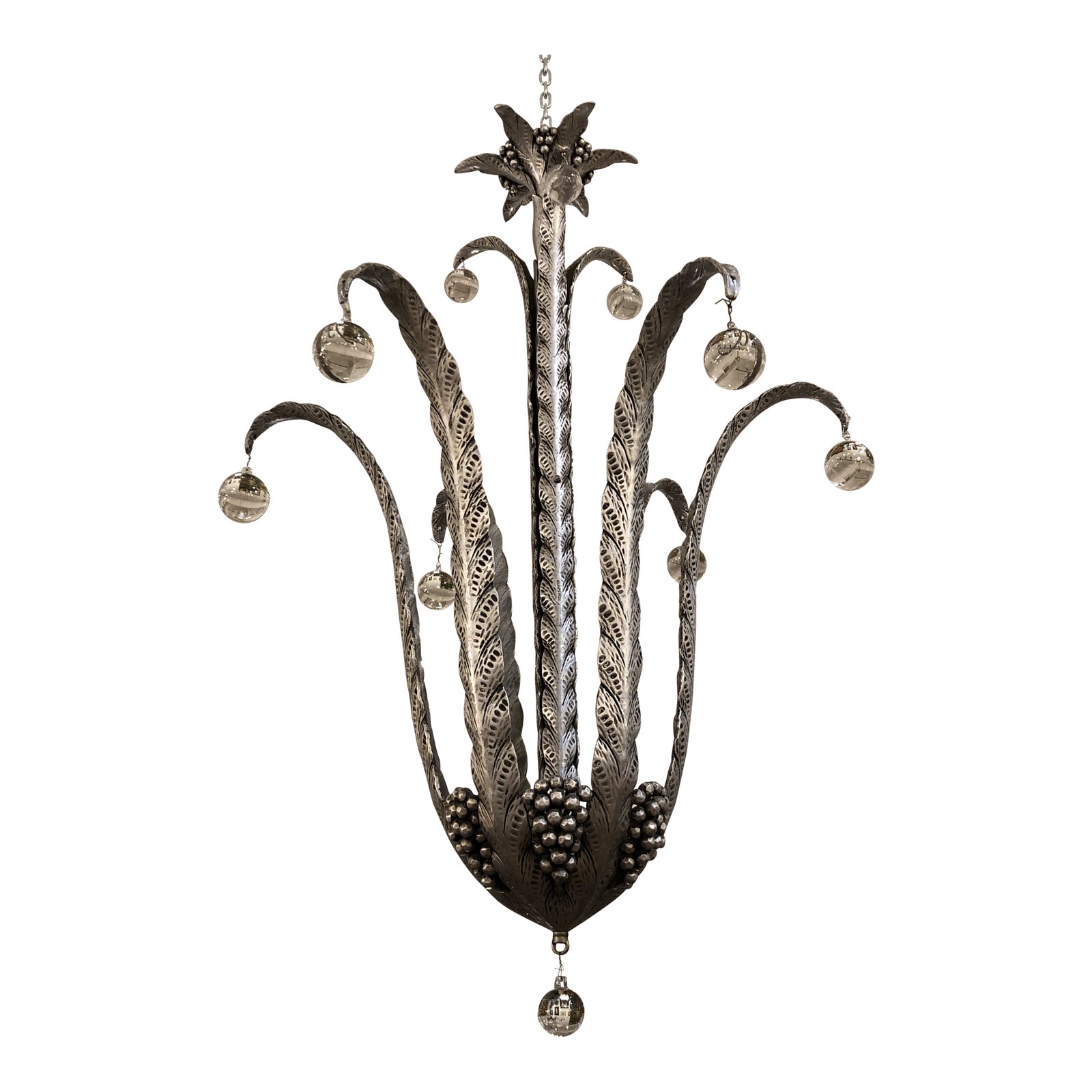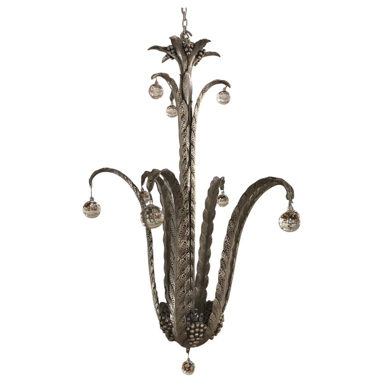 Design Plus Gallery presents a Mid-Century light fixture. Original purchased from he Dinah Shore Estate in Palm Springs. The frame is cast metal with six long flaring leaf arms. Three smaller arms towards the top of the lighting. Each arm consist of a single round glass ball. The bottom has accented grape motif with a glass ball. Consist of five lights. The metal is in a silver finish.