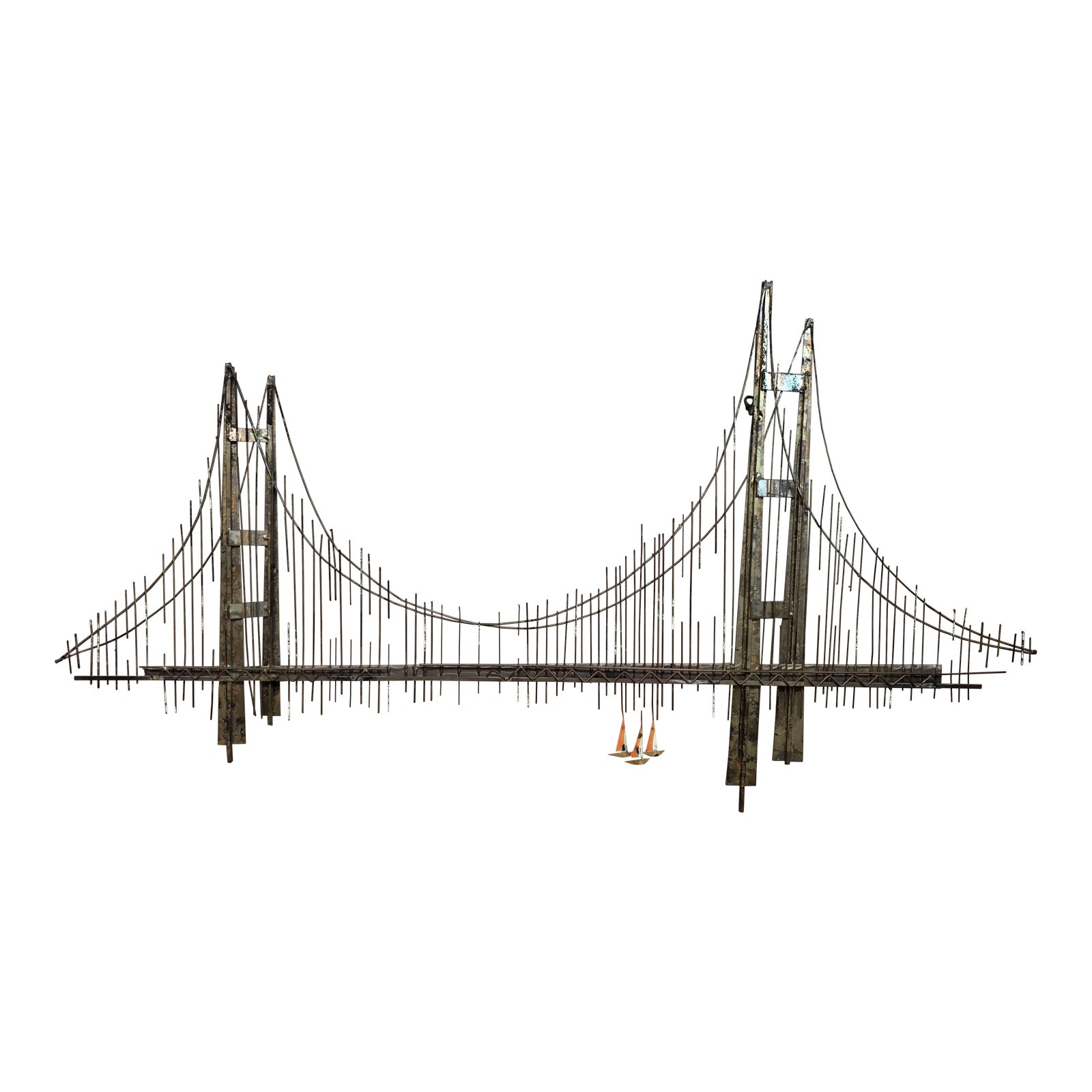 Design Plus Gallery presents a Vintage Brass Wall Hanging. Depicting the Golden Gate Bridge in San Francisco, this beautifully patina finished piece is a focal point and a talking point. Three colorful sailboats, or are those windsurfers, sail beneath the span.
