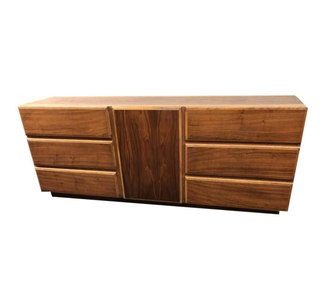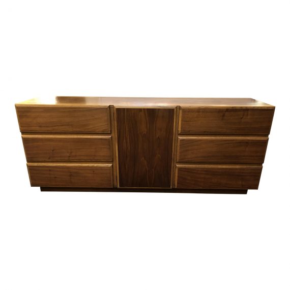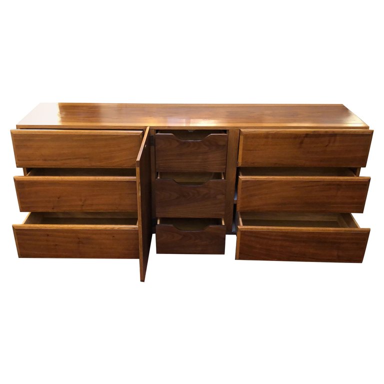 Design Plus Gallery presents a 9-drawer from Lane Furniture. A mid-century beauty crafted in solid cherry woods and veneers. The right hinge center door swings open to reveal three pullout drawers. Aged gracefully, an iconic design that fits in our Modern Day. Made in USA.