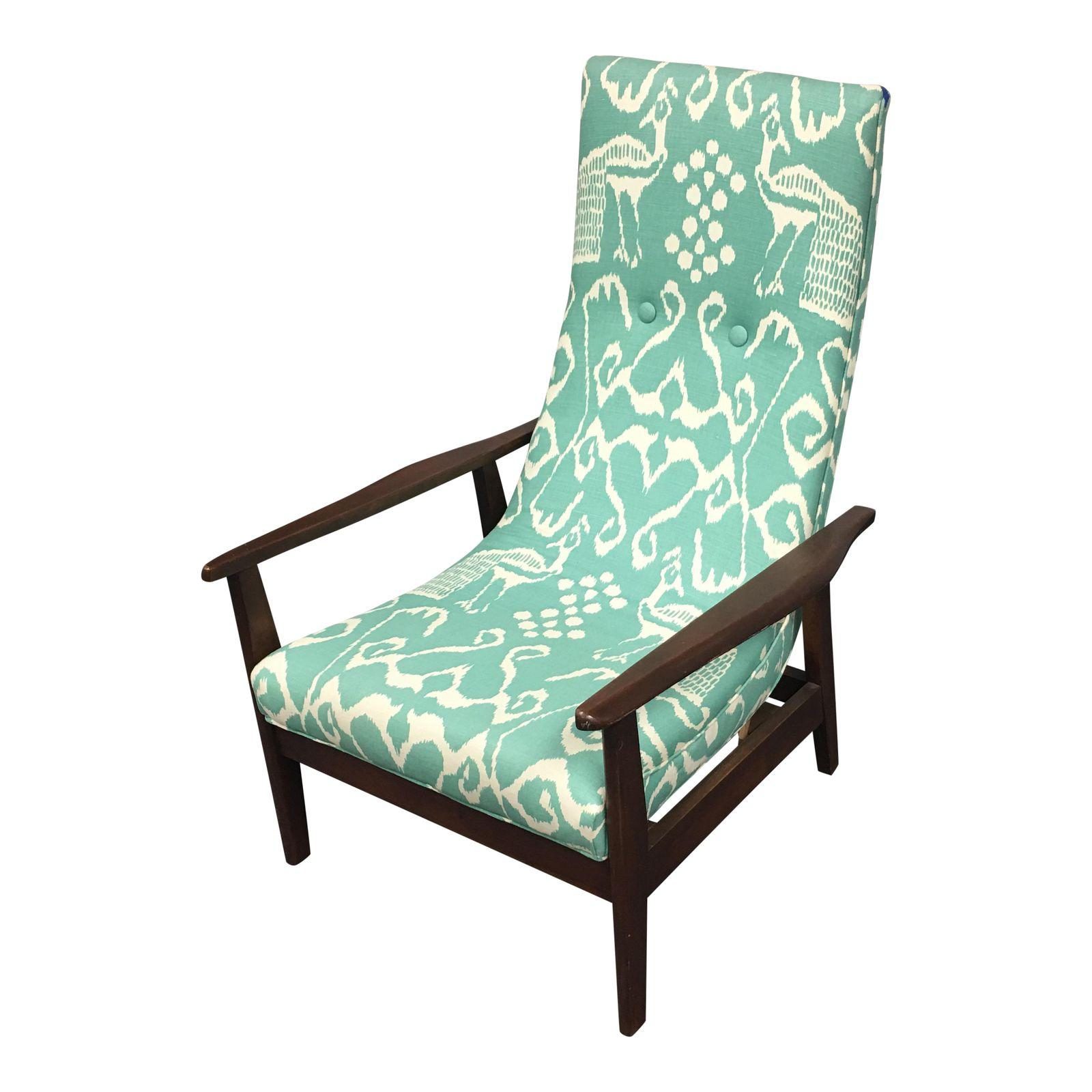 Design Plus Gallery has a lovely mid-century lounge chair. The wood frame has clean lines with a pastel boho chic print. Upholstered in coveted designer textile by China Seas (Bali II- turquoise on tint-2430/31). Unique combination of high-impact, high-end upholstery and classic mid-century modern design.