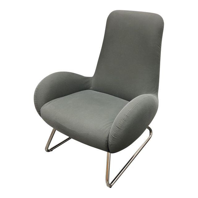 Design Plus Gallery presents a mid-century modern arm chair. Upholstered in a charcoal synthetic fabric. The base are metal chrome plated. The arms are curved with a flared tight upholstery. Arm Height: 24 inches Seat Height: 18 inches