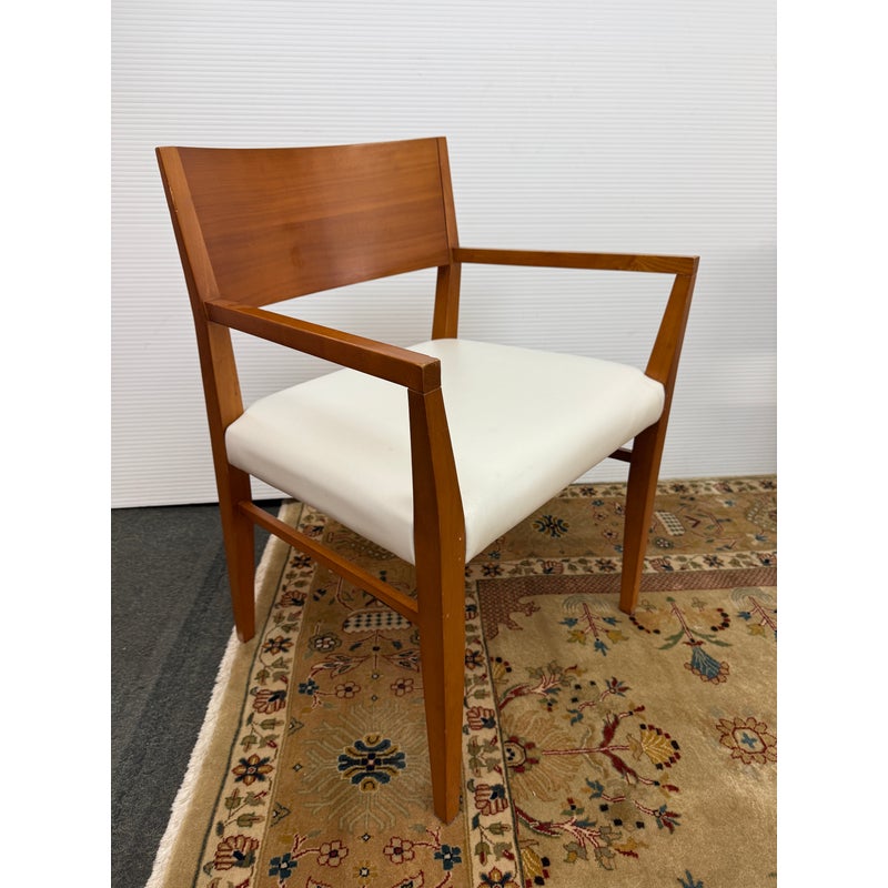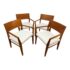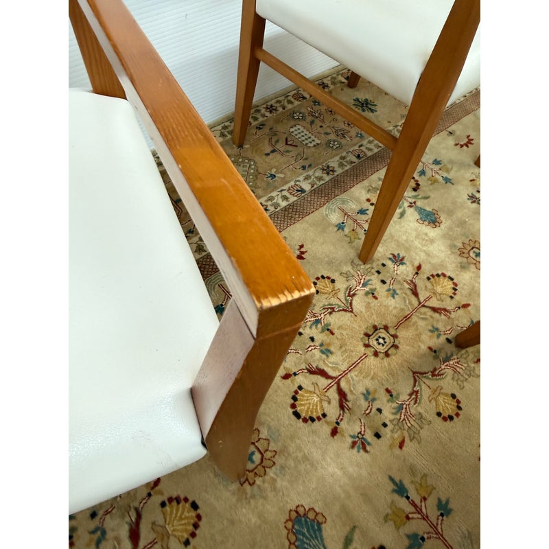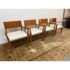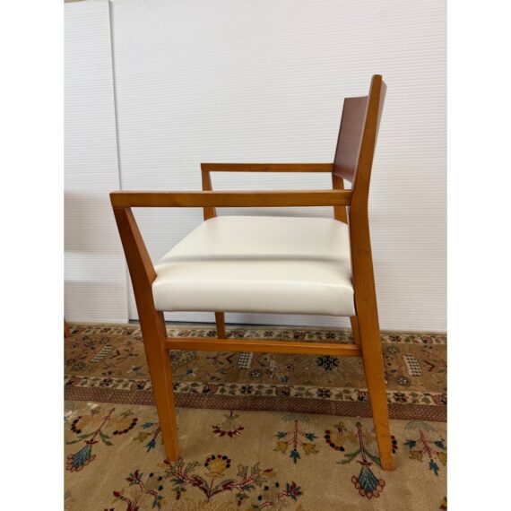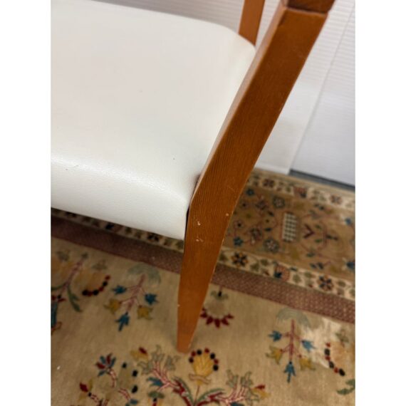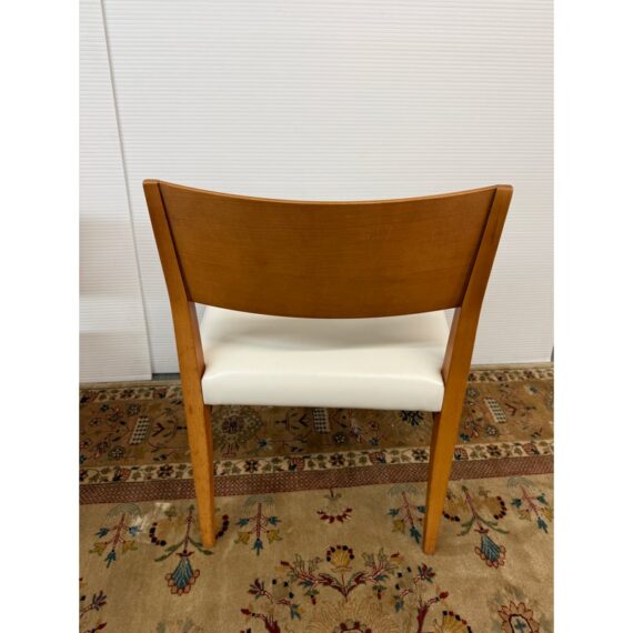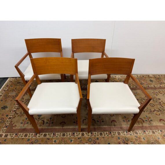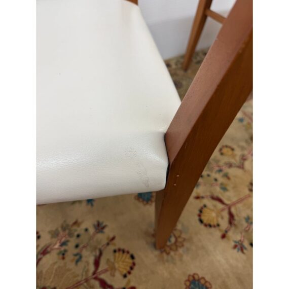 Design Plus Gallery presents a Set of Four Mid Century Modern Chairs. The set of chairs has a nice honey brown tone of teak wood with a protective coating on them. They have been refurbished by Tiburon-Belvedere Interiors with a nice, clean white leather like upholstery that is slick and makes them more refined. The chairs show so wear to the wood that is consistent with usage, but overall, they are in good condition.