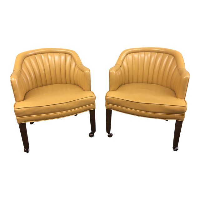 Design Plus Gallery presents a pair of Vintage barrel chairs on casters. The chairs are upholstered in a Golden Yellow Naugahide material. The pair could be pulled up to a table for dining or simply side chairs for extra seating.