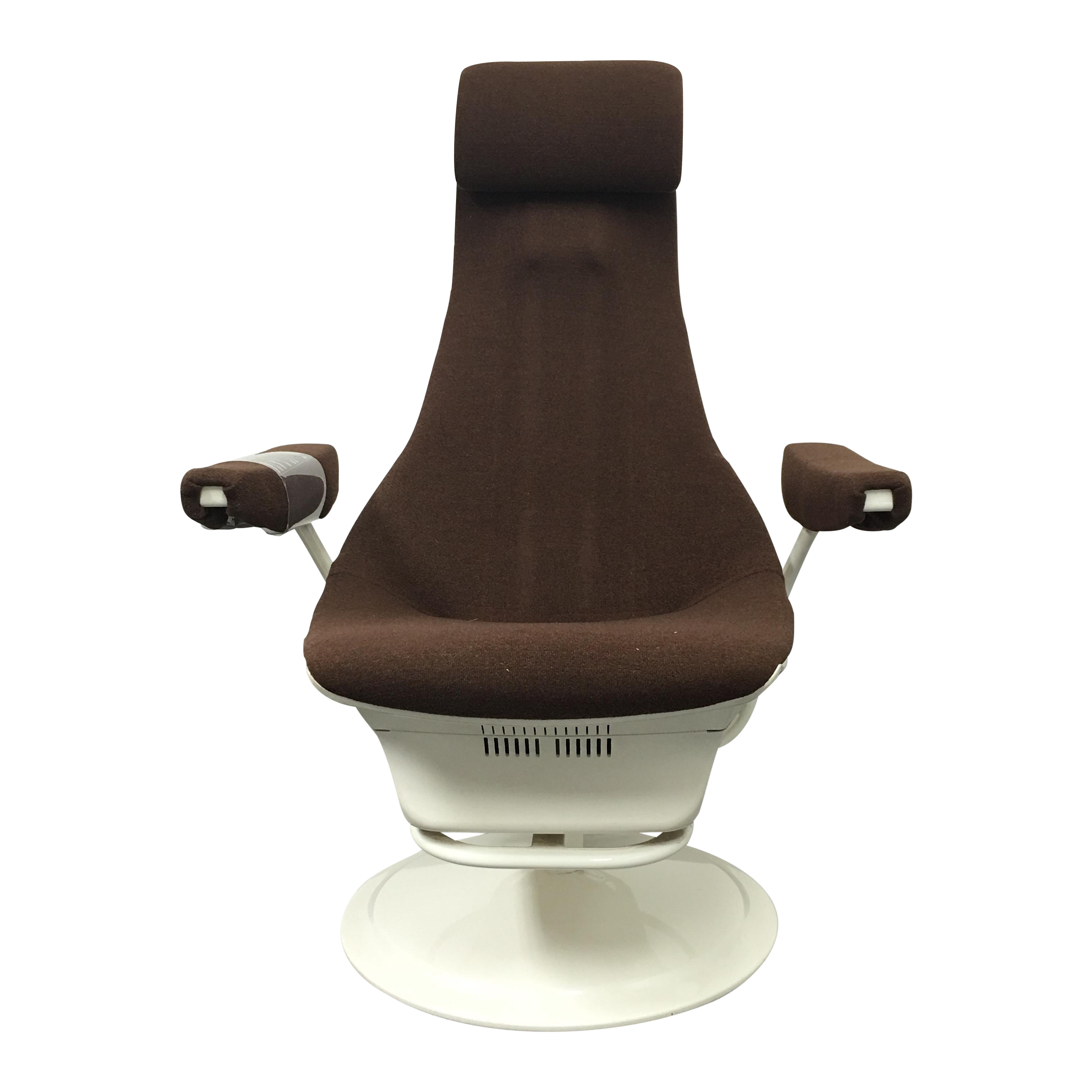 Design Plus Consignment Gallery has a Mid-Century Panasonic Massage Chair EP525. The chair design has a tulip design base with a sleek futuristic frame. The chair is a swivel and upholstered in a brown fabric.