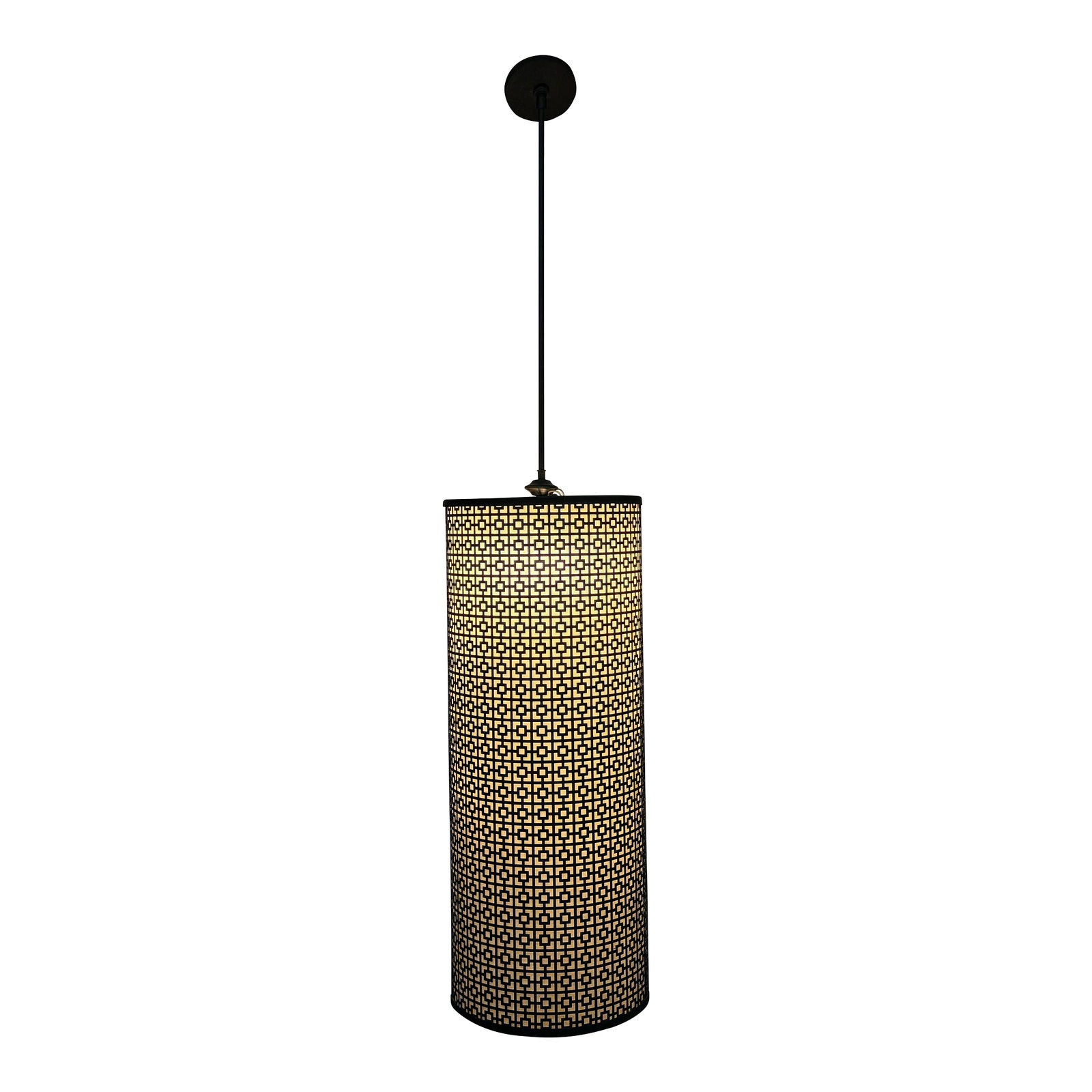 Design Plus Gallery presents a Pendant Light by Shaper Lighting Products, Richmond California. Classic mid century style, the tall pendant light is a column of geometric mesh metal wrapping a full length diffuser. Warm glow fills the entire column. Originally had two sets of three lights, only the top set remain; condition is fair for age and use.