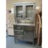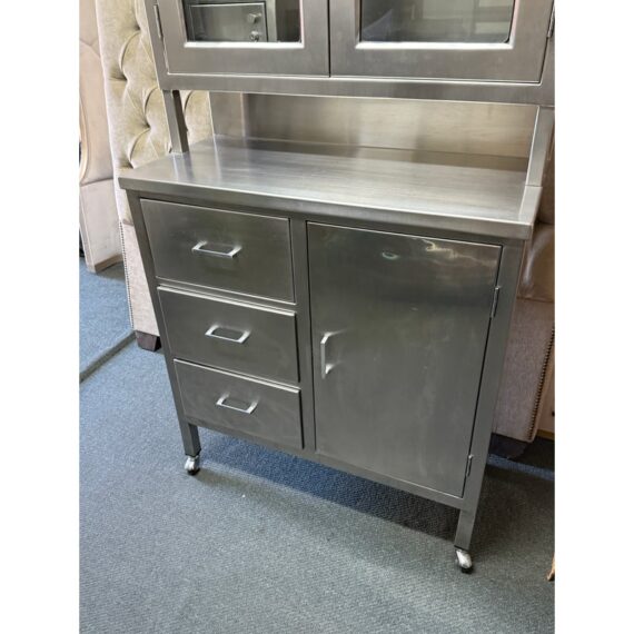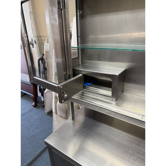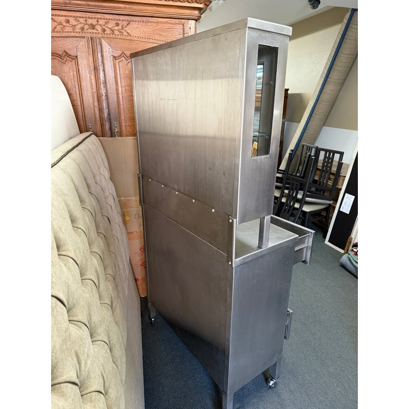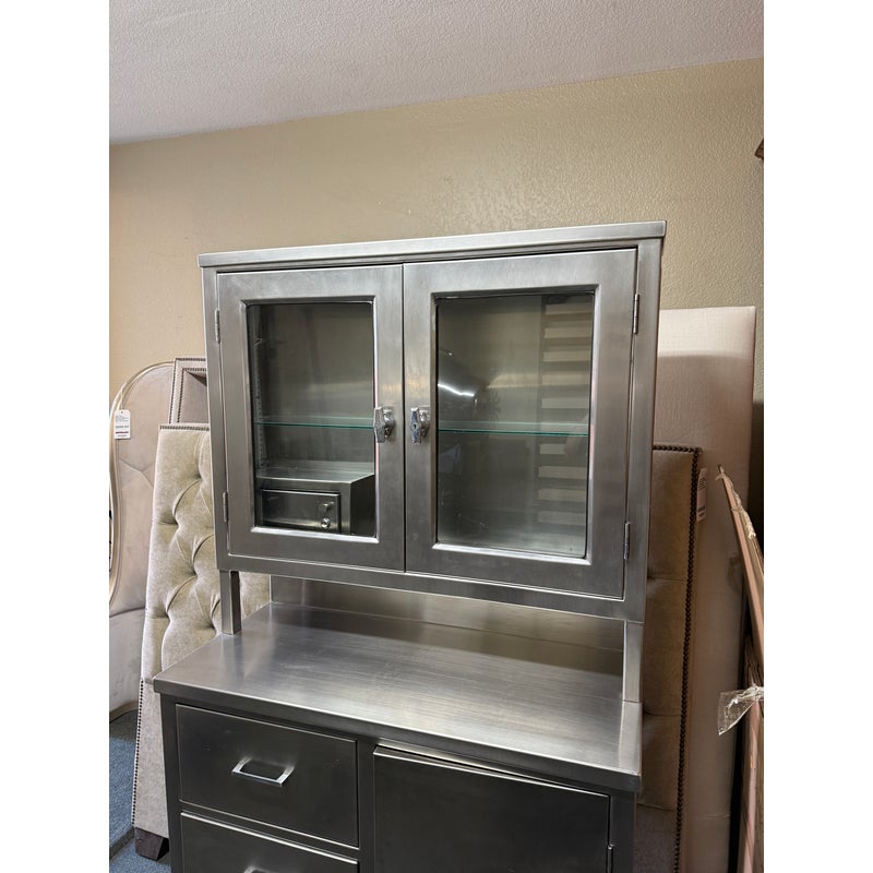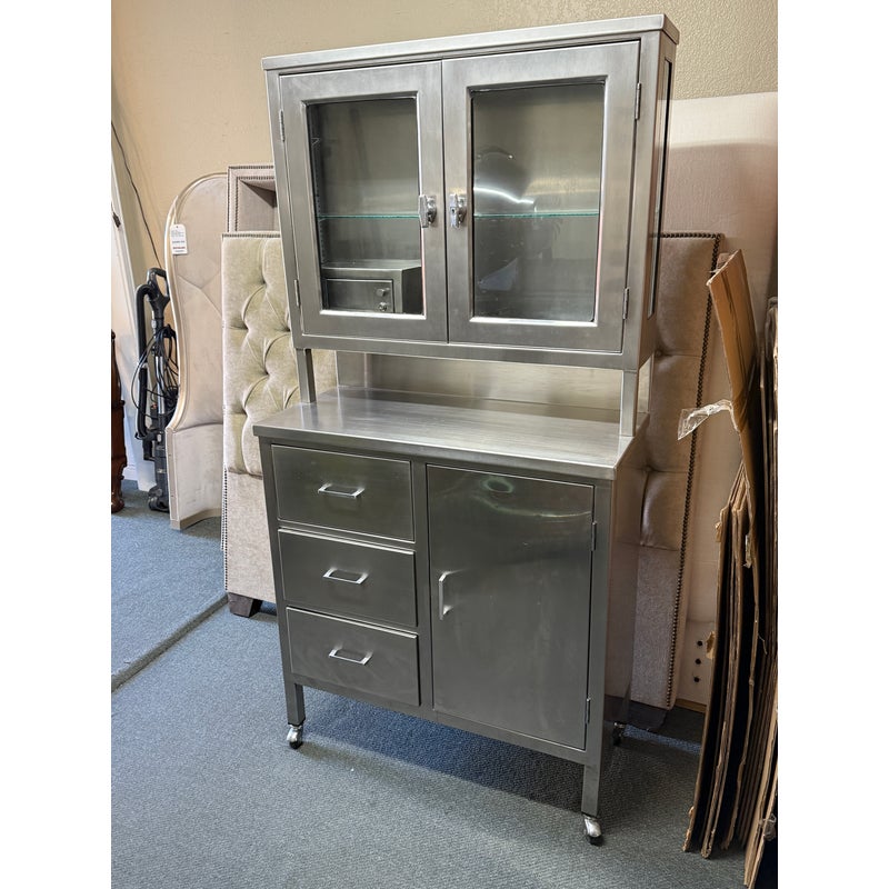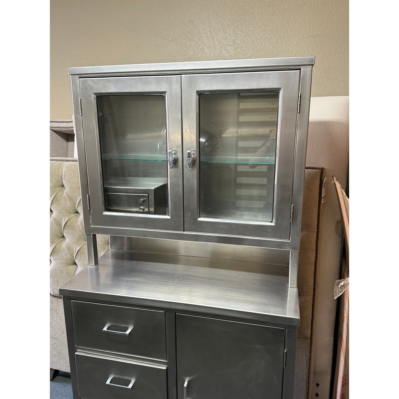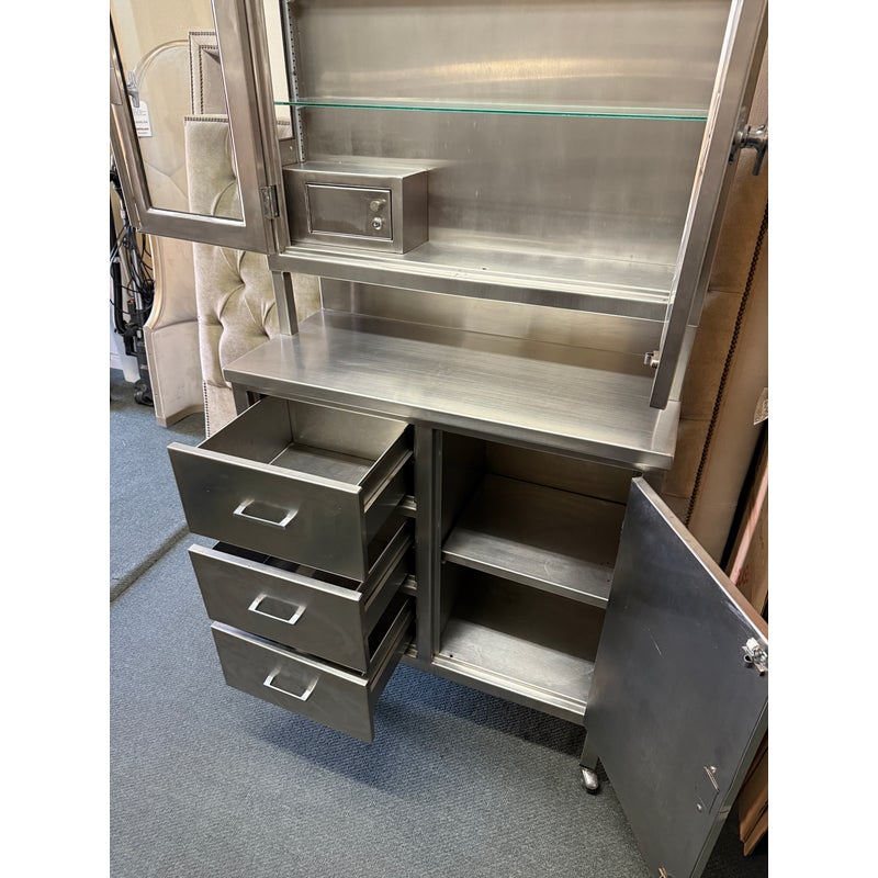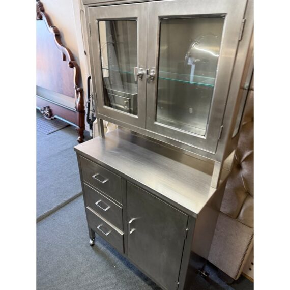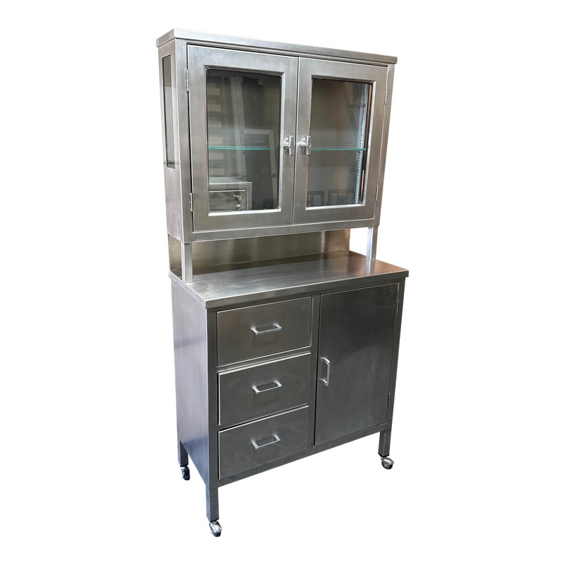 Design Plus Gallery presents a Medical Cabinet likely from the Mid 20th Century. The stainless steel cabinet is constructed from 18-gauge stainless steel with a seamless welded face providing long lasting durability, strength with corrosion resistance. The upper section has two glass shelves, a small locking compartment (with key), and glass doors. There is a roomy lower section with three drawers + a single cubby offering a removable shelf. Steel casters allow the heavy cabinet to be moved easily. Light surface wear is present and one locking door is missing its key. Condition is good for its usage.