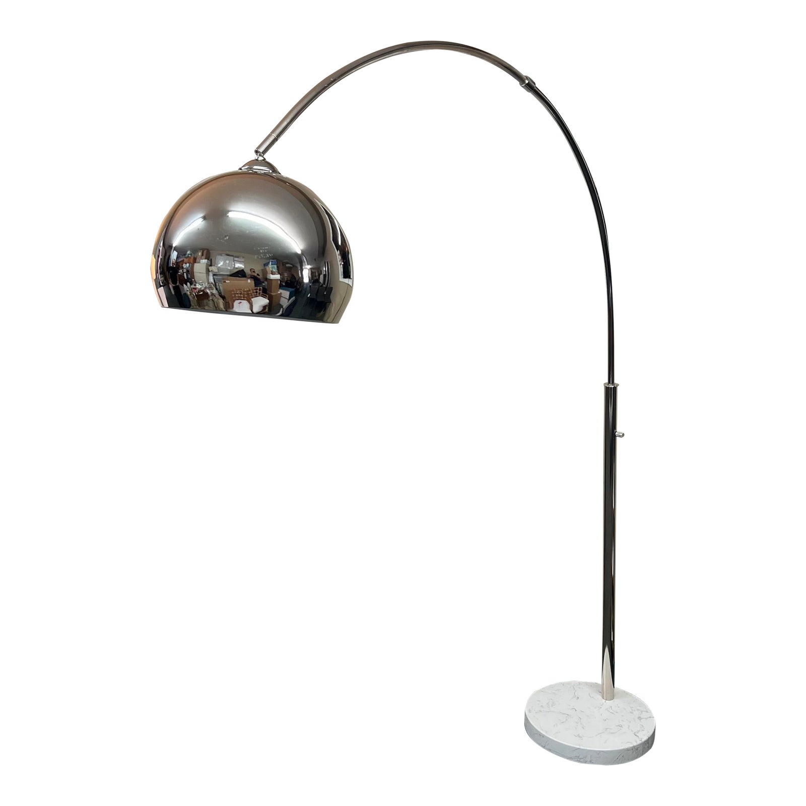 Design Plus Gallery presents a Modern Floor Arc Lamp. A nod to the Mid 20th Century designs. A chrome plated adjustable tubular frame with a half orb shade. A round white marble base wights down the arc lamp. There is slight tilt on frame. Visible and minor wear from usage + age. Made in China.