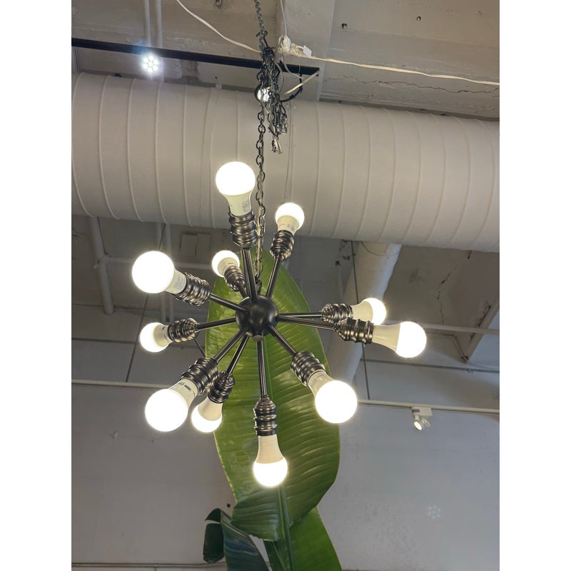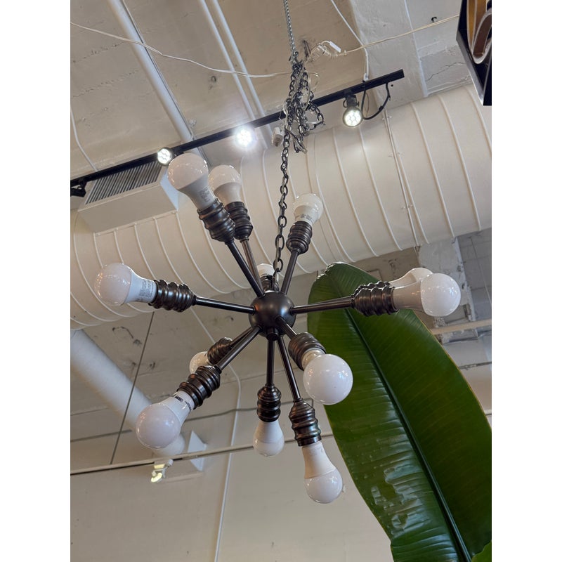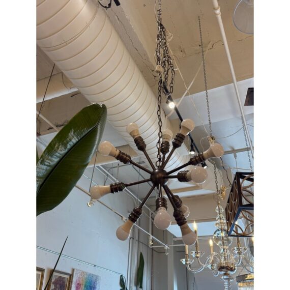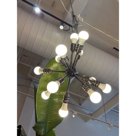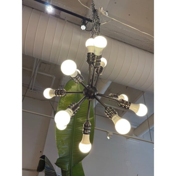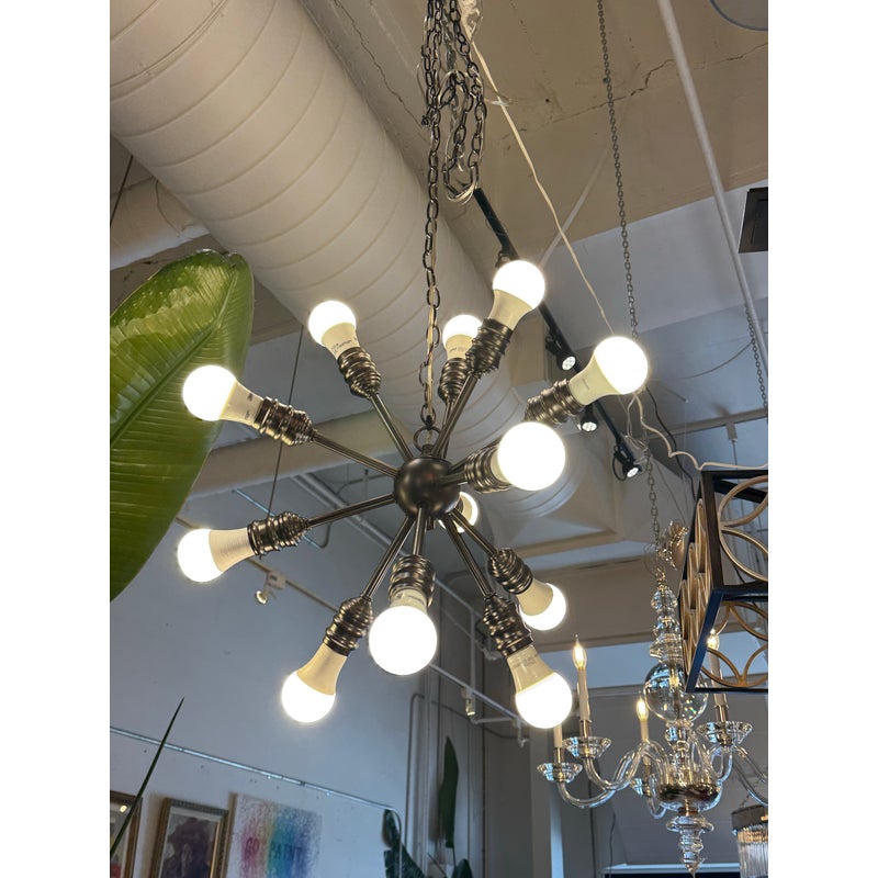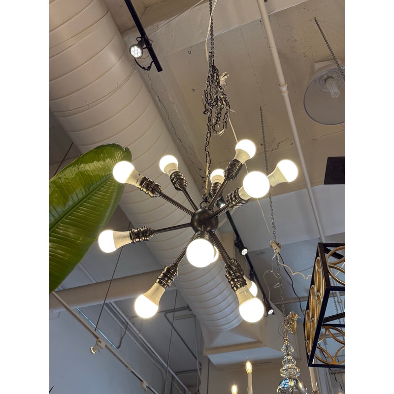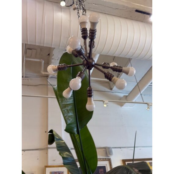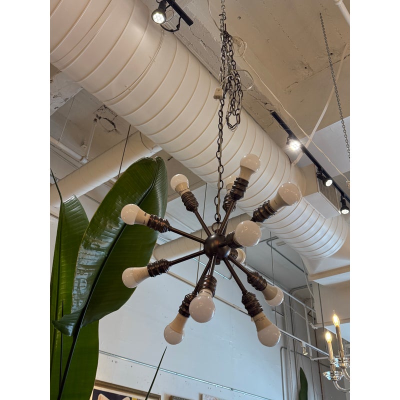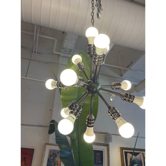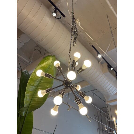 Design Plus Gallery presents a Twelve Arm Sputnik Pendant. The wall hanging unit is so cool and will liven up your dining, living, basically any area with its mid 20th style charm. It offers twelve pendants for lights of your choice to enhance your rooms setting. The use of multi-hued lights could set the vibe to party time or romance enable with the use of a soft glow. The chandelier is in good condition and comes with an adjustable chain from its canopy, offering you a plethora of placements in your home.