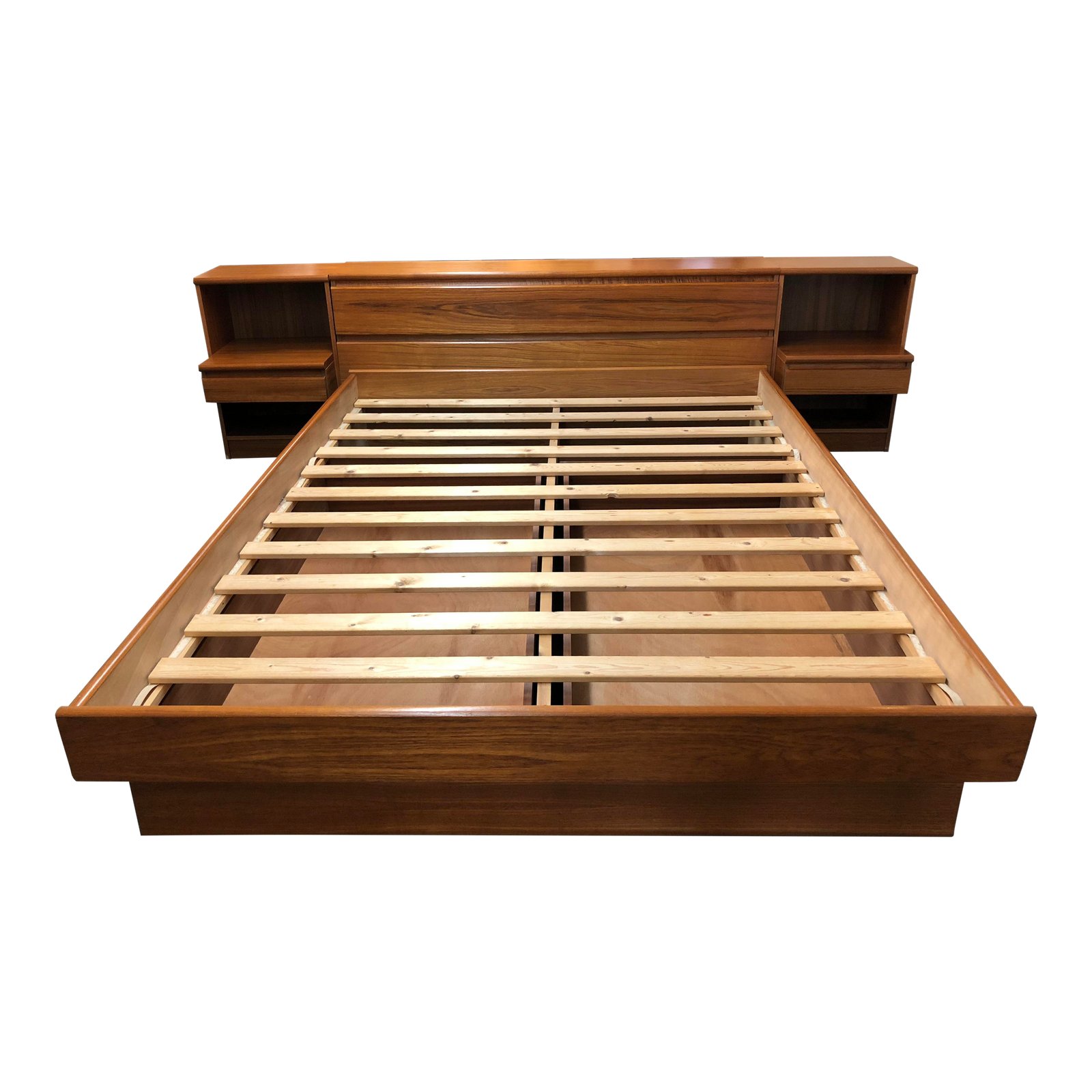 Mid Century Teak Queen Storage Bed With Nightstands, Made in Denmark