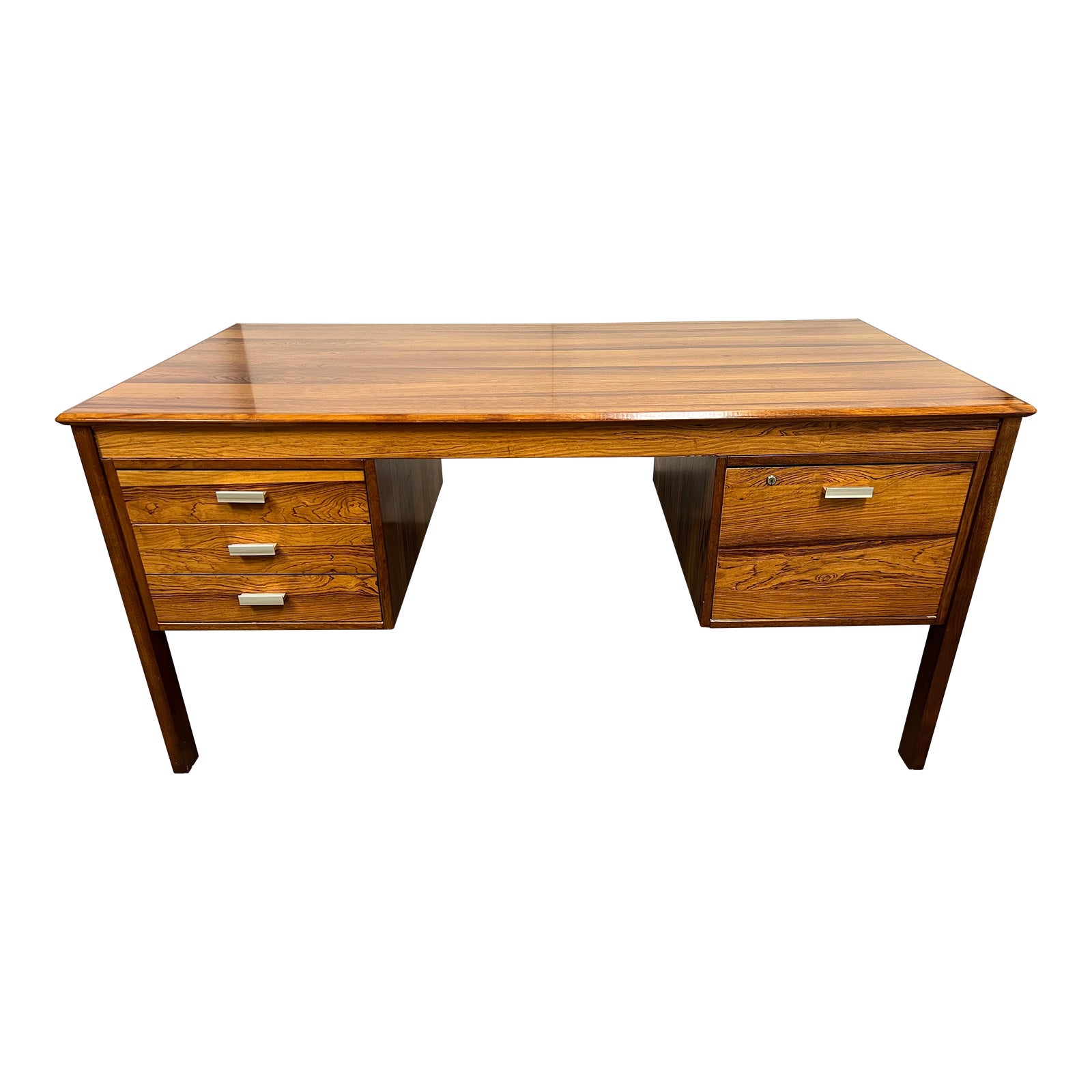 Design Plus Gallery presents a Mid-Century Wood Veneer + Metal Desk. Constructed primarily with wood. The drawers and top are covered with a veneer; the drawers also have rectangular pulls. There are three regular drawers and a fourth for filing, all with upholstered bottoms. The legs are square with no taper. Visible + minor wear from use; desk is in good condition.
