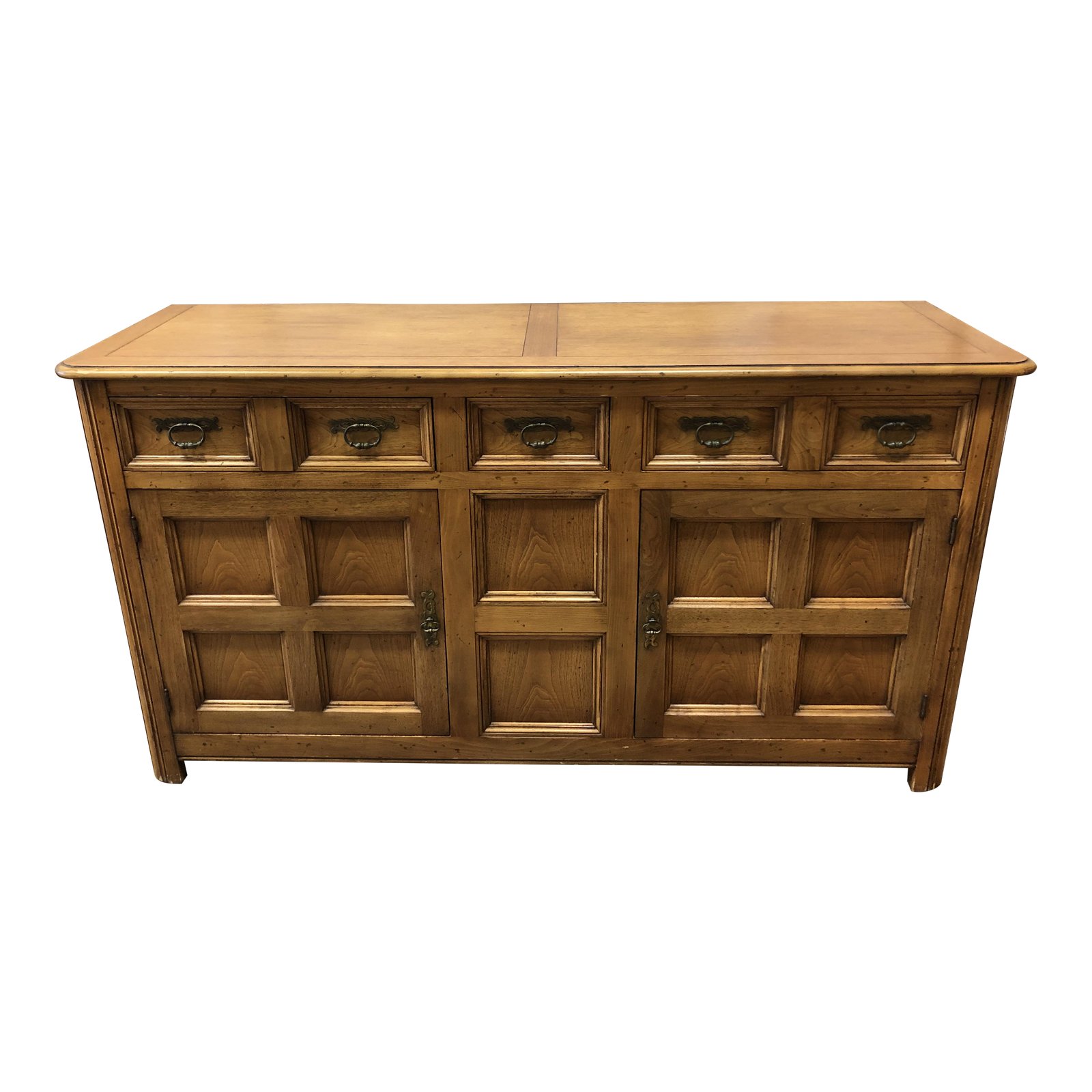 Design Plus Gallery presents a credenza by Baker Furniture. From the Milling Roads Collection. A mid-century crafted piece from solid woods and veneers. Visible wear on surface. Consist of three pullout drawers with two sing open doors with a single inner shelving. The design has square geometric panels. The hardware is iron pulls.