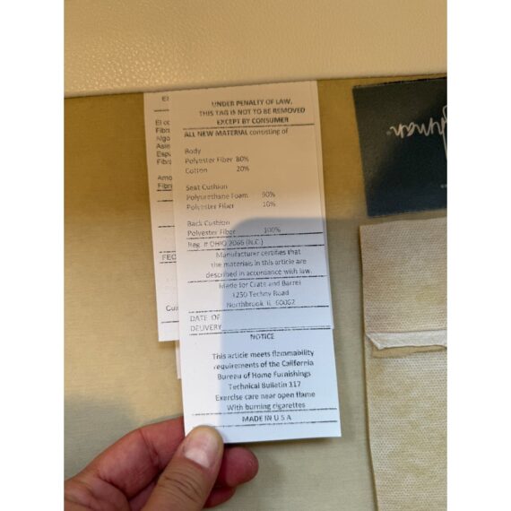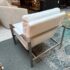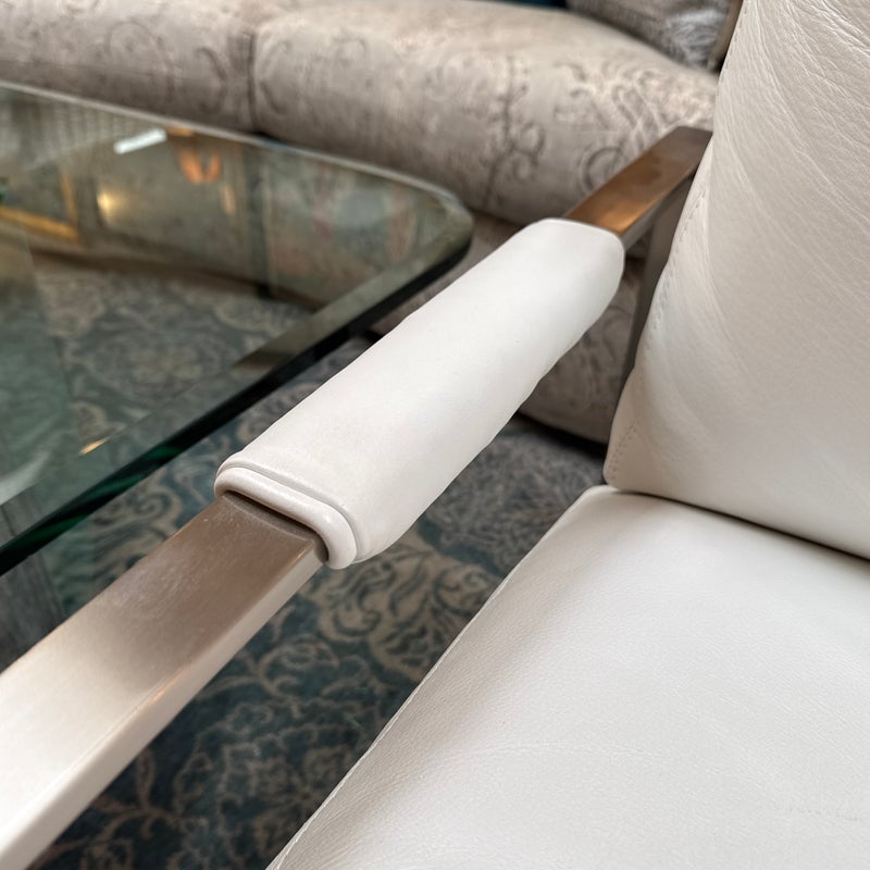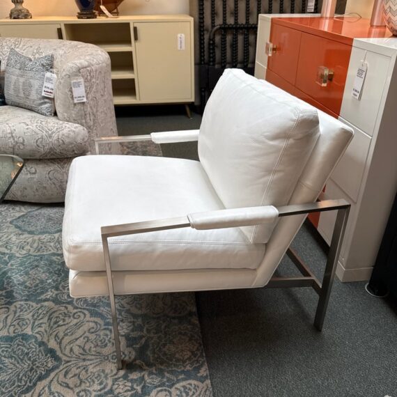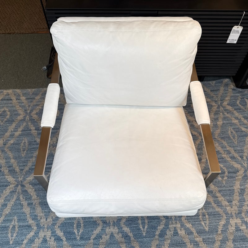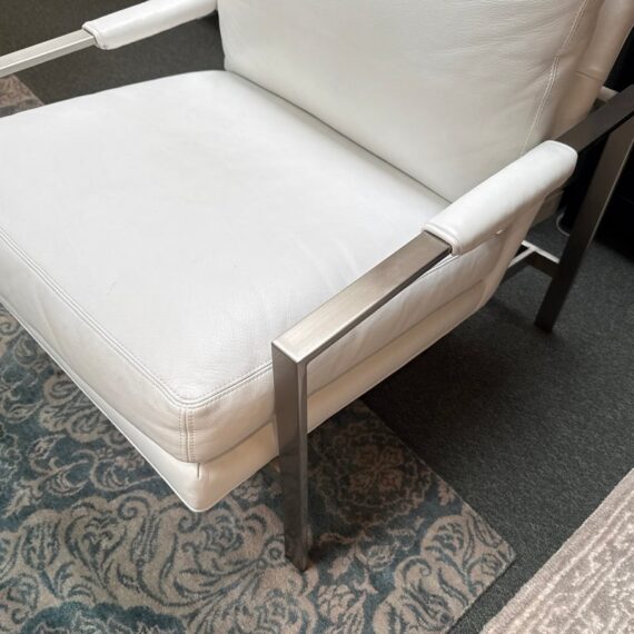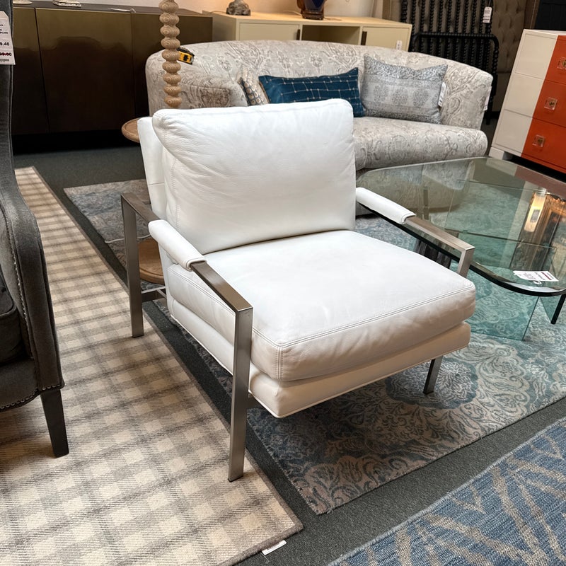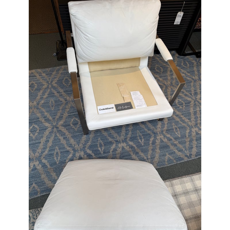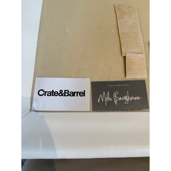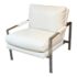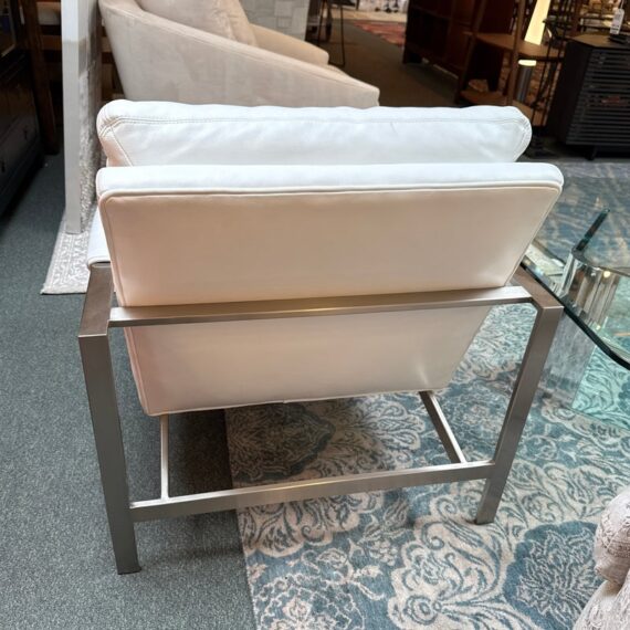Design Plus Gallery presents a Lounge Chair Designed by Milo Baughman from Crate & Barrel. This reproduction chair has the designers brand seal of approval (with complimentary tag) and design rights for reproduction. The chair has two loose cushion for the seat and back in white linen fabric that resists staining. There is also an additional fixed cushioned seat and back rest that impacts the design and instills the Baughman design from the mid 20th century. The arm and rest of the frame are in a satin finish metal. The brand is no longer producing the replica lounge chairs. Overall it is in good condition with minimal signs of visible wear for its usage.