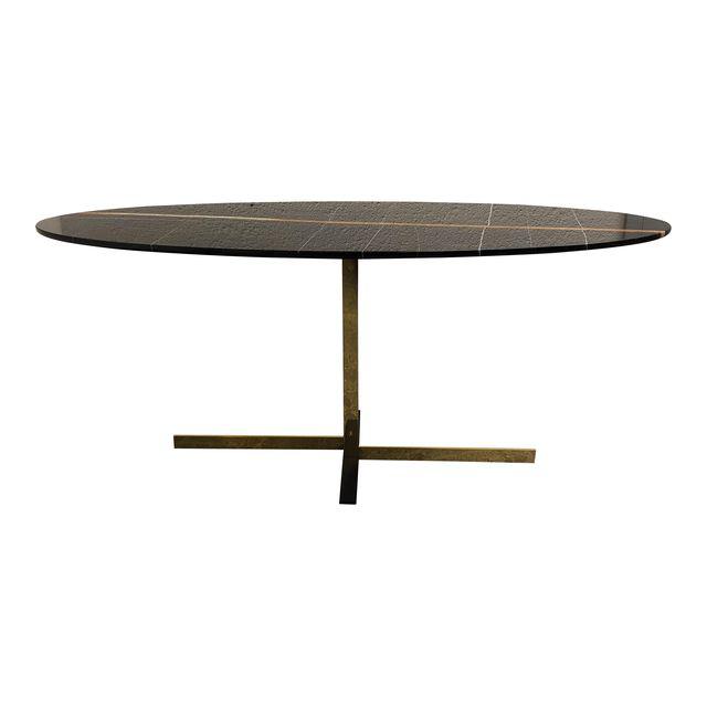 Design Plus Gallery presents a Minotti Caitlin console table. The Caitlin line was designed by Rodolfo Dordoni for Minotti. The elegant metal base features a cross-pattern motif and is finished is bright a Gold Made of metal, composed of a pair of “C”-shaped legs with bright Gold-plated finish (electroplate) that screw into a center, structural, upright with an upper and lower crosspiece powder coated in textured Black. The stunning base is topped with a beautiful oval marble slab which has a beveled edge. The surface does show water ware but can easily be r- polished. The Marble color is Sahara Noir and has dramatic grain running through it in White and shades of Burnt Orange.