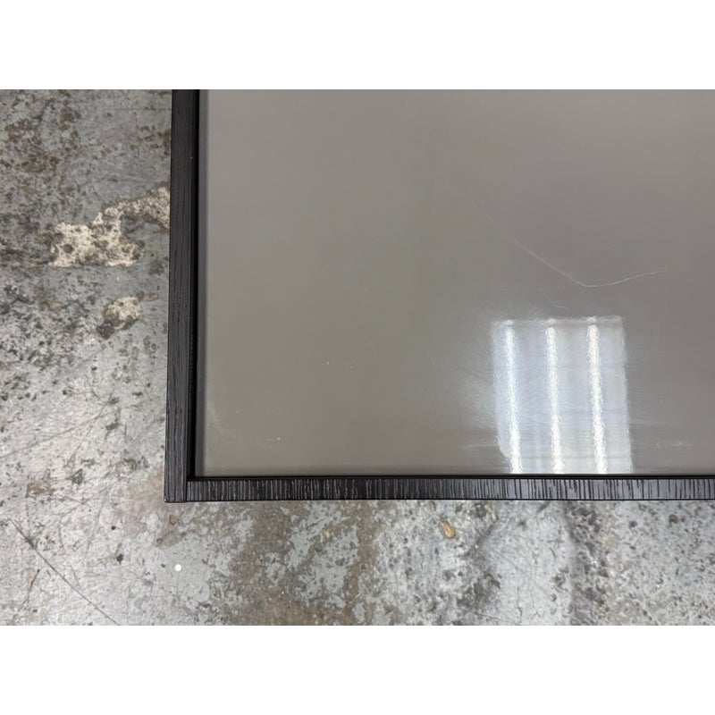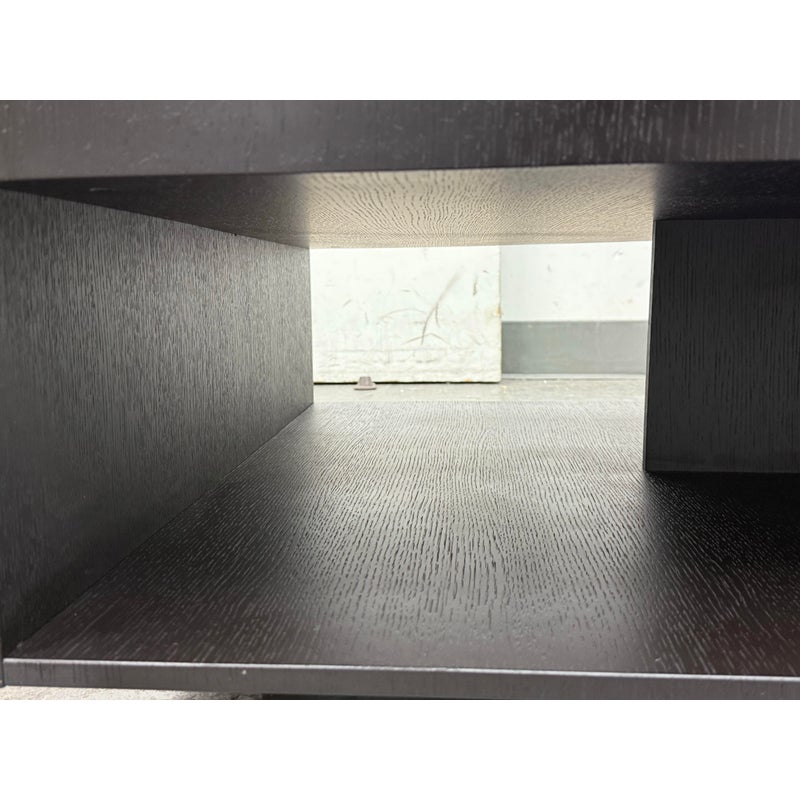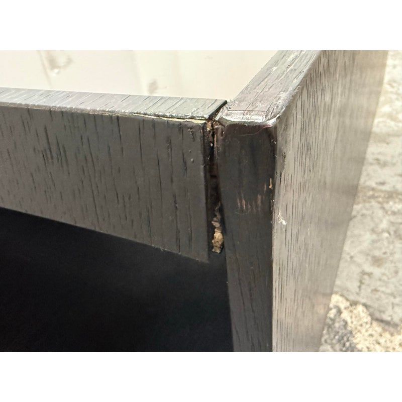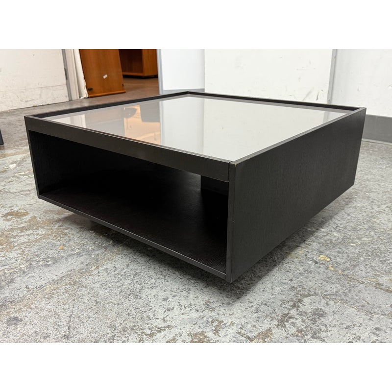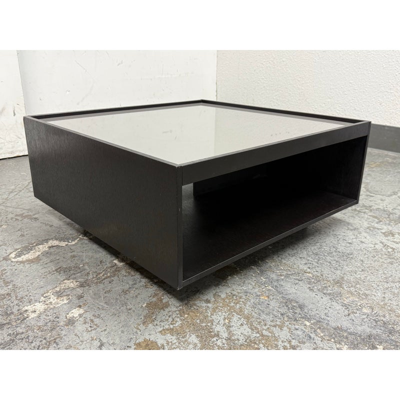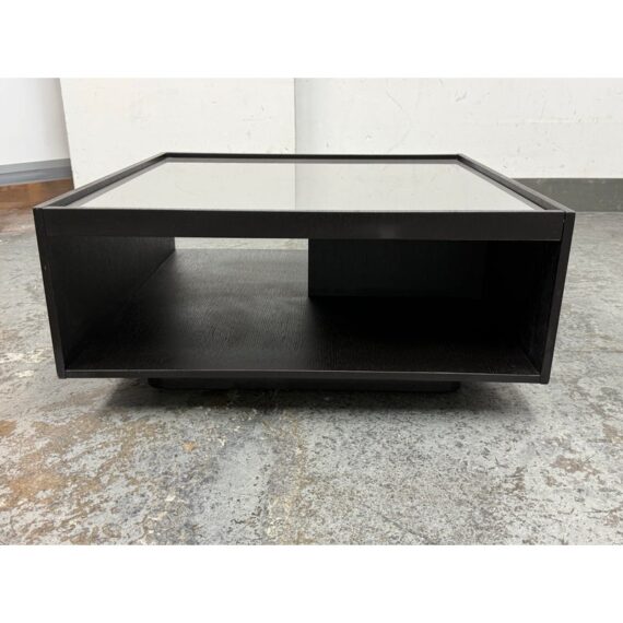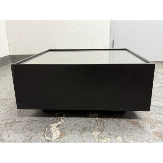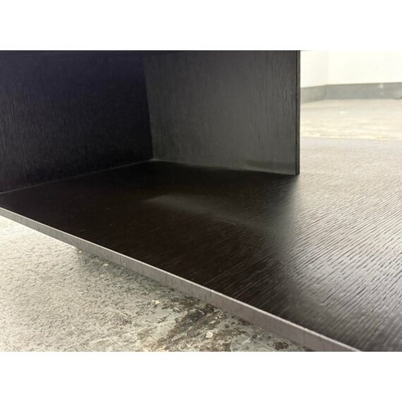 Design Plus Gallery presents a “Nightstand” from Minotti. Designed by Rodolfo Dordini. Low to the ground. The finish structure is an open pore Moka lacquered oak, and glossy Clay-colored lacquered top. Was a Showroom Sample, in fair condition, visible heavy wear from usage. Made in Italy.