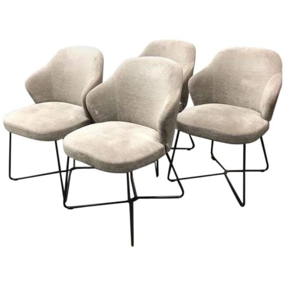 Design Plus Gallery presents a set of four dining chairs. The Leslie was designed by Rodolfo Dordoni for Minotti. The backs and the arms have been incorporated to give the chairs a light airy feeling. The seats and backs are upholstered in a Gray Velvet like fabric which has a slight ribbing . The chairs sit on Black powder coated criss cross hair pin legs. Your dinner guests will want to linger ,the chairs are that comfortable.