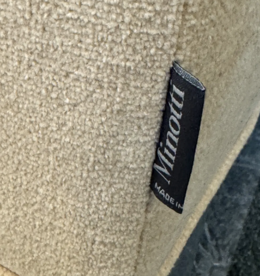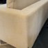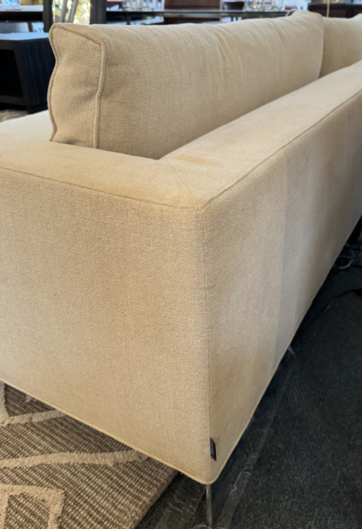 Design Plus Gallery reenacts a Minotti Two Piece Sofa. Low and deep, the simple silhouette is wrapped in neutral, textured upholstery for a clean and contemporary vibe. Elevated slightly on polished steel legs, the lounger appears to float in your space. Down wrapped foam, the loose back and seat cushions are cozy without being sloppy. Visible stain under cushion; condition is fair for age and use. Made in Italy.