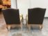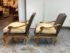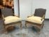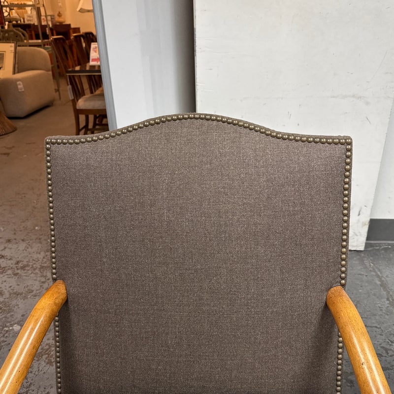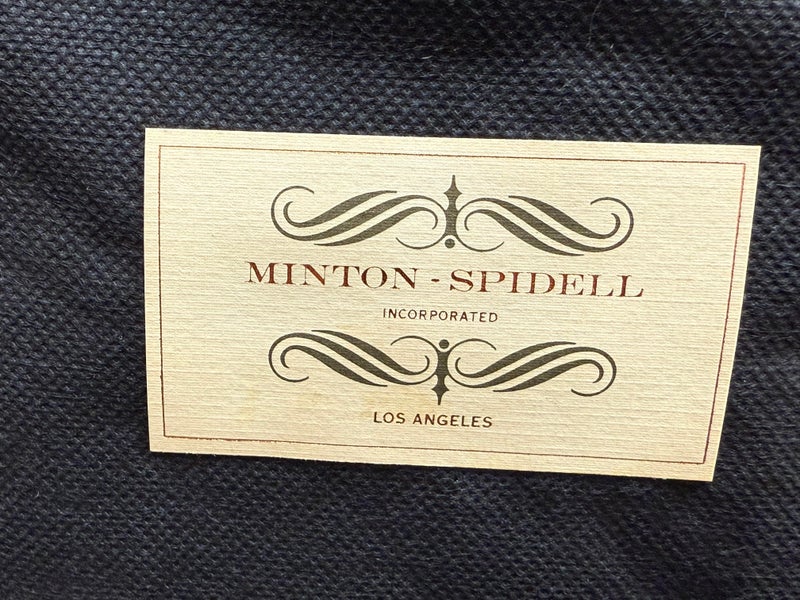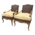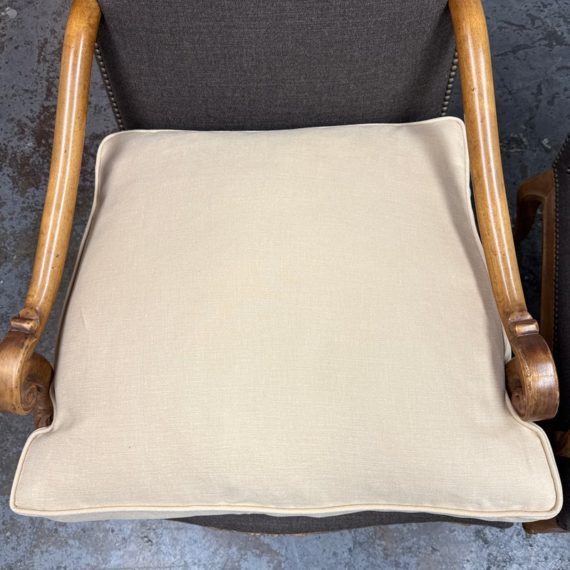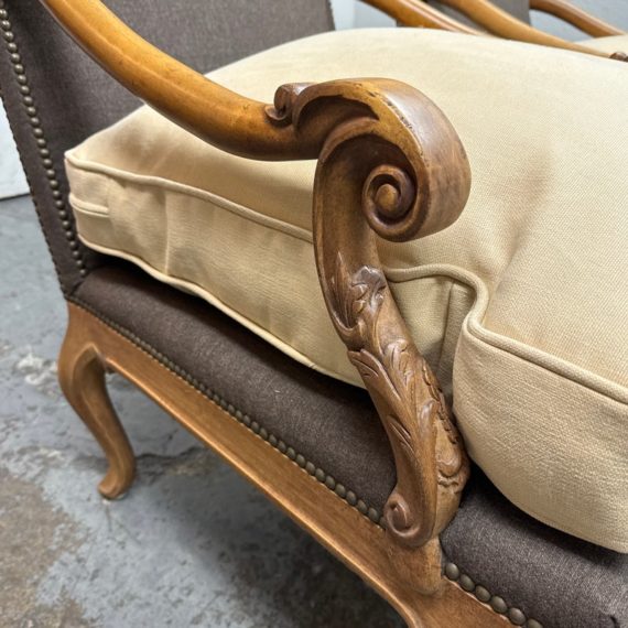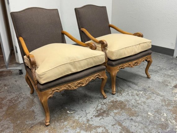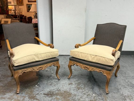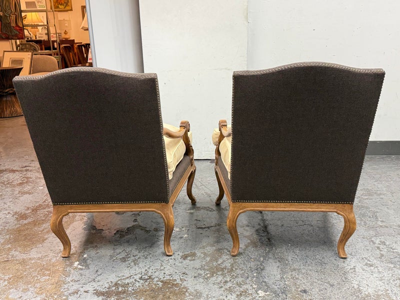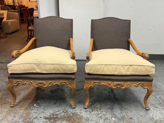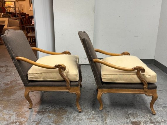 Design Plus Gallery presents a Pair of Minton-Spidell Lounge Chairs with Oak Wood Frame in the French Country Style. They give off that casually sophisticated air of true easy elegance that any quiet luxury home requests. The oak wood frame has ornamental details of superb carve from the frame of the arms to the apron and cabriole legs. The gray felted wood covers the body of the frame with nailhead attaching. The seat cushion is loose and in a complimentary tan tone of cotton weave. The chairs are both in good condition with minimal wear for their usage. Made in Los Angeles, California, USA.