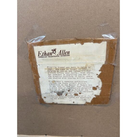 “A contemporary Israeli painter and printmaker, Mireille Kramer immigrated from Egypt to Israel in 1951, enrolled at the Hebrew University and then studied etching techniques at the University of Milan, went to Paris and continued her art education at the Ecole de Louvre and at the Academie Julian. Finally, the artist completed her education at the Pratt Institute in New York. As early as 1957 the art of Mireille Kramer received national recognition when she was awarded the Millerman Prize at the Young Artists of Israel Exhibition. Since that time her original prints and paintings have been included in exhibitions at such major galleries as the Museum of Modern Art, New York, the Mussee National d’Art Moderne, Paris, and at the Tel Aviv Gallery.