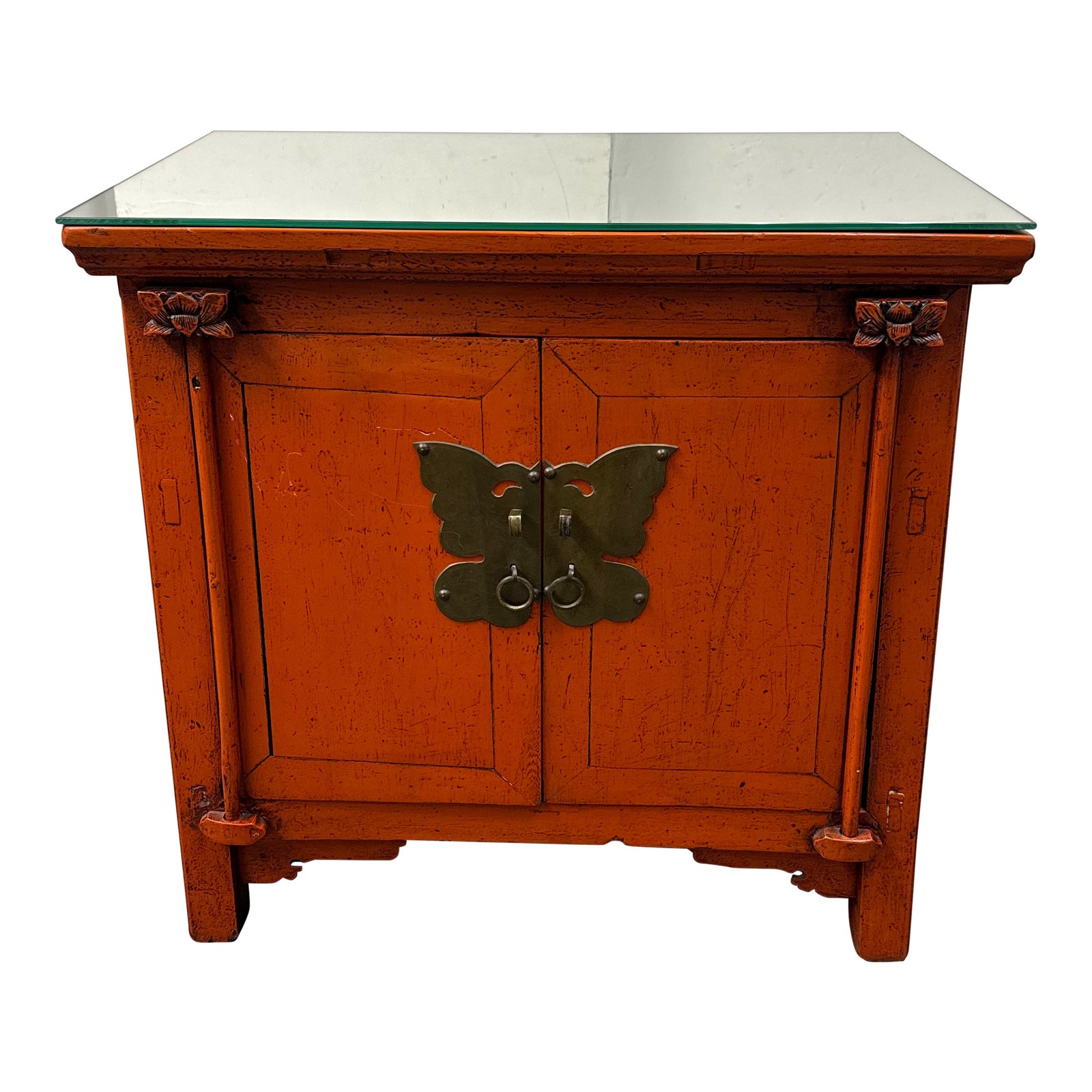 Design Plus Gallery presents an Antique Style Butterfly Cabinet with Mirror Top. The chest has one internal shelf and two hidden compartment drawers behind the brass plated butterfly doors. The brass emblem is the showpiece for this antique looking chest. A mirror piece has been added to the surface to protect wood from use. The chest is missing the key to keep cabinet doors secure. Due to age there are there are areas of visible wear but is overall in good condition.