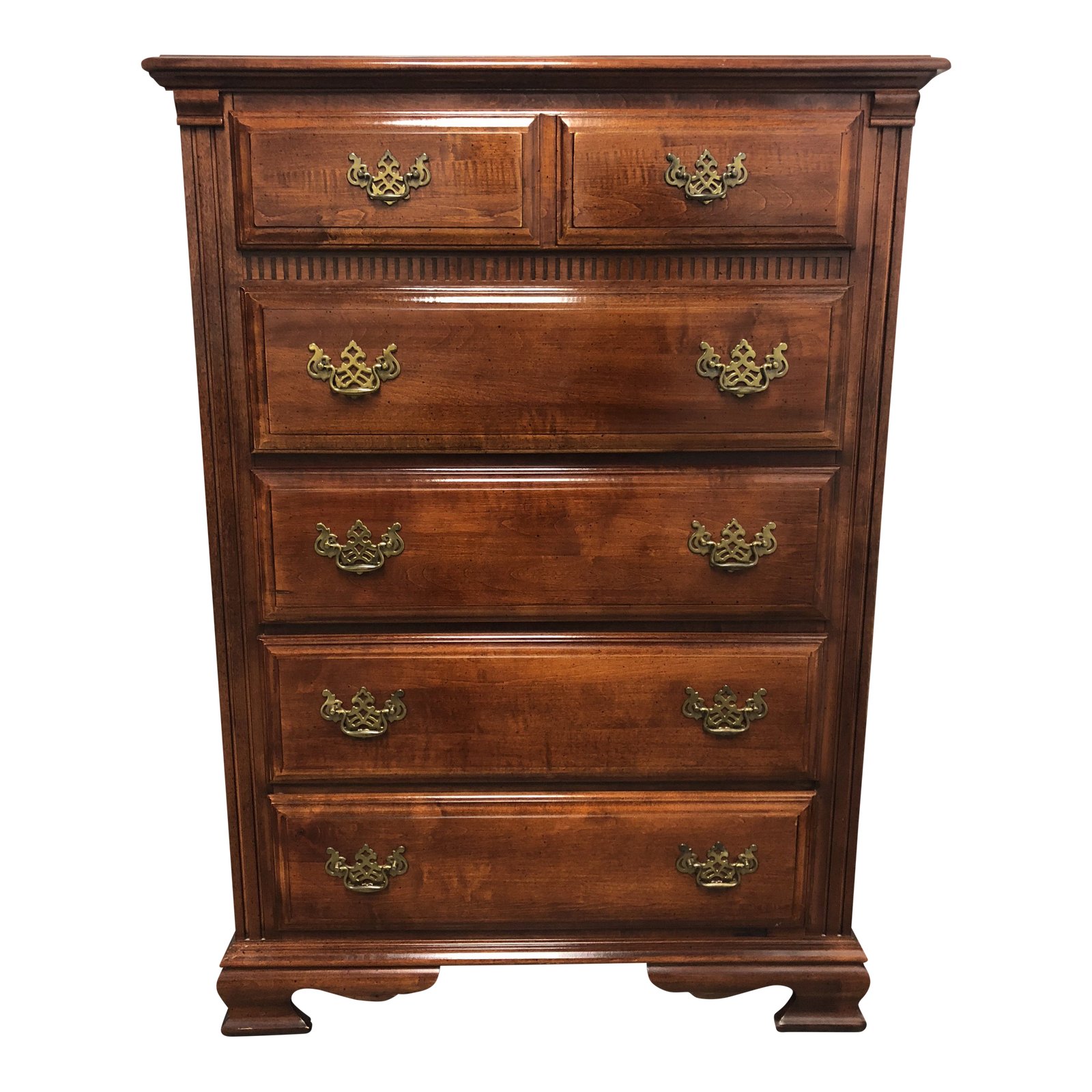 Design Plus Gallery presents a five drawer dresser by Stanley Furniture. The frame is cherry wood with five pullout drawers. The pulls are a brass ornate hardware. A traditional and mission style combined.