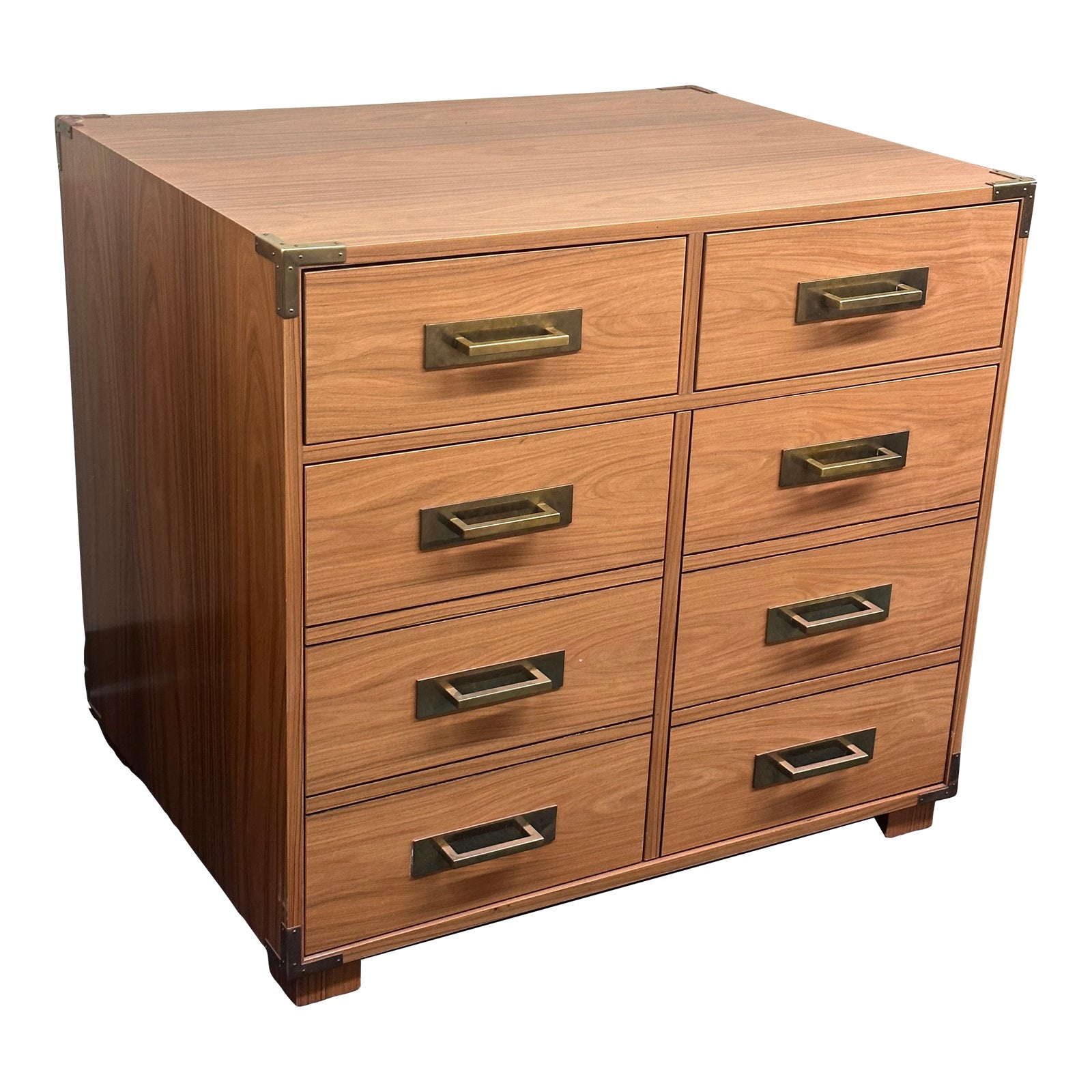 Design Plus Gallery presents a Custom Campaign Chest Cabinet by Mitchel Berman Cabinetmakers, Inc. A one of a kind in configuration, materials and craftsmanship, the cabinet was handcrafted to perfection. Pau Ferro Bolivian Rosewood veneers and solid wood dovetail joint construction. Two deep drawers and two faux-drawer doors sport brass Nanz pulls with custom Bauhaus backplates. The doors open to reveal adjustable shelves and cord access for AV gear. The cabinet has a hand rubbed and waxed “French Polish” finish and fully finished back., elevated slightly on block feet. Light surface wear; sun exposure has caused discoloration and crackling of polish on top; good condition.