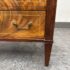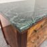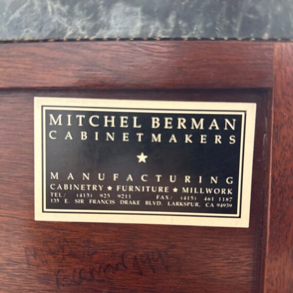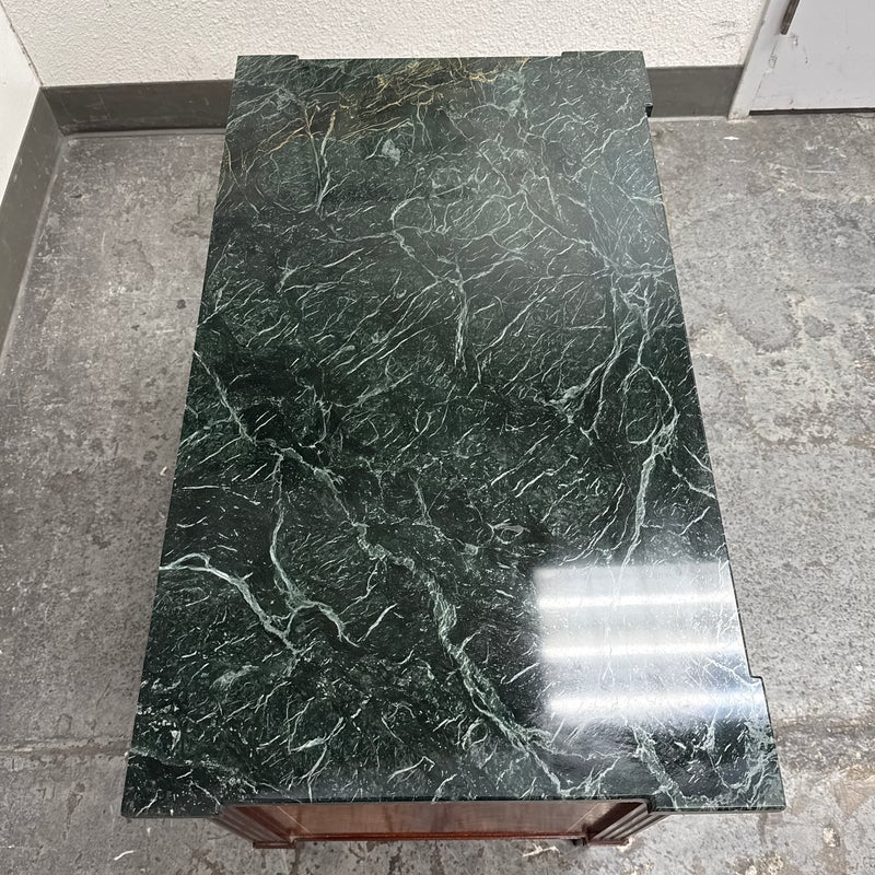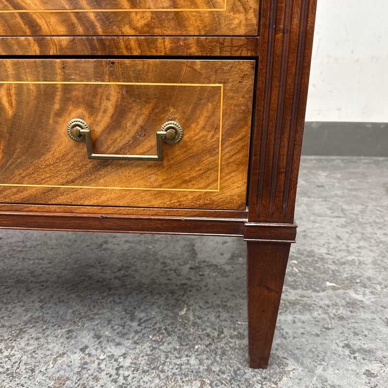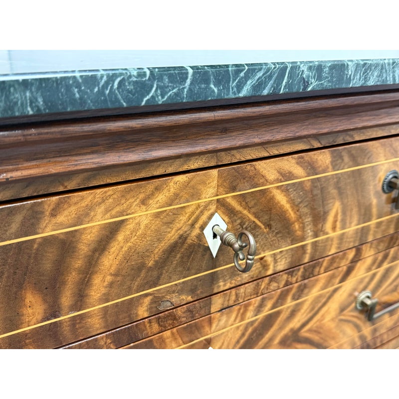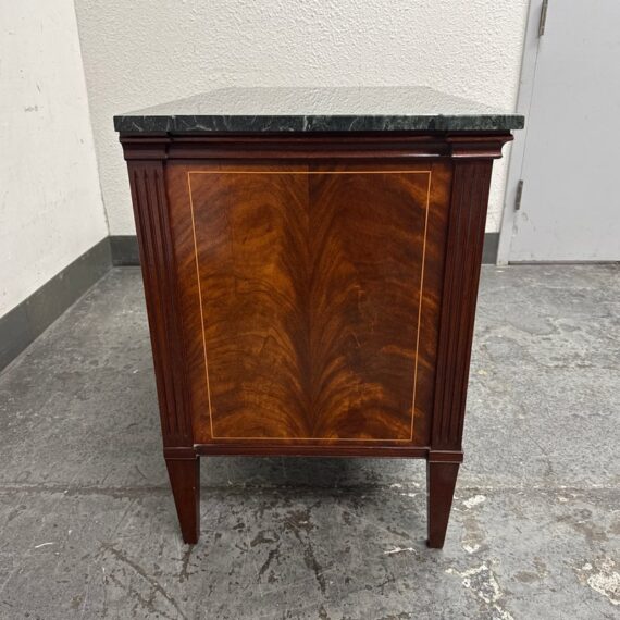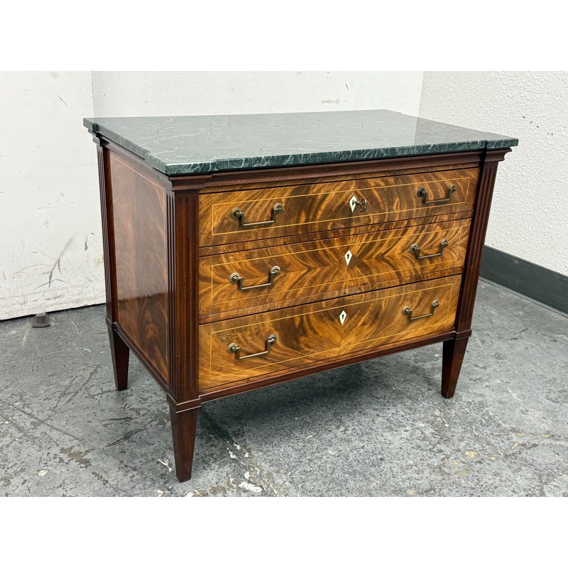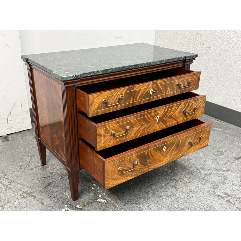 Design Plus Gallery presents a Louis XVI Style Commode from Mitchel Berman Cabinetmakers. Mitchel Berman who was one of the Premier custom Cabinet Shops in the Greater San Francisco Bay Area. They specialized in the design and fabrication of fine custom cabinetry and furniture for residences and business. This commode was custom made with the finest of materials in a Neoclassical style; noted for its linear lines, classical motifs, and elegant proportions. The chest has three drawers that have burl wood veneers with matching up of grain patterns, a body frame of flame mahogany that gives it an impressive beauty, and a green marble surface. Three equal size drawers with diamond shaped inlay for key holder for each drawer. The commode is in good condition with minimal surface wear for its usage.