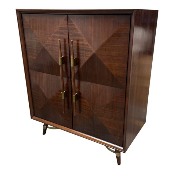 Design Plus Gallery presents a Lasalle Barn by Mitchell Gold & Bob Willaims. Great style and versatility, easy to imagine as a bar or as a style statement in an entryway. Doors feature a raised diamond-parquet pattern and distinctive cylindrical wood-and-brass pulls. Splayed legs are accented with antique-brass wraps. Behind the doors, an interior drawer lined with black felt, with the signature red lacquer on the sides. Back of drawer has cord management cutouts so it can work as a charging station for mobile devices, making it an especially good organizer in an entry. Below the drawer are two shelves that can be removed and reversed to function as standard shelves or bottle storage. Visible and minor wear from usage + age. Made in USA.