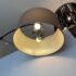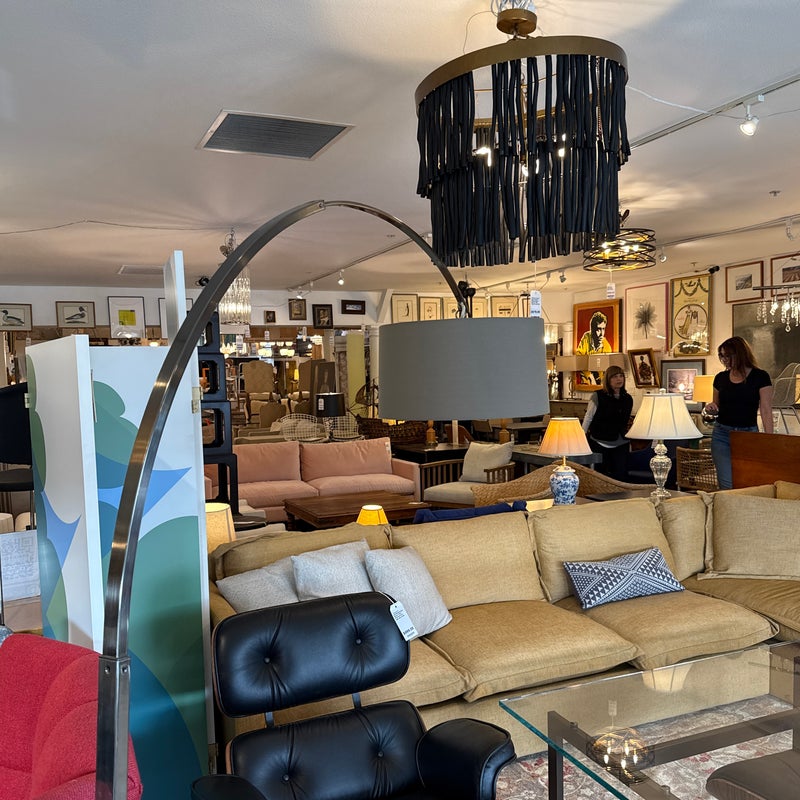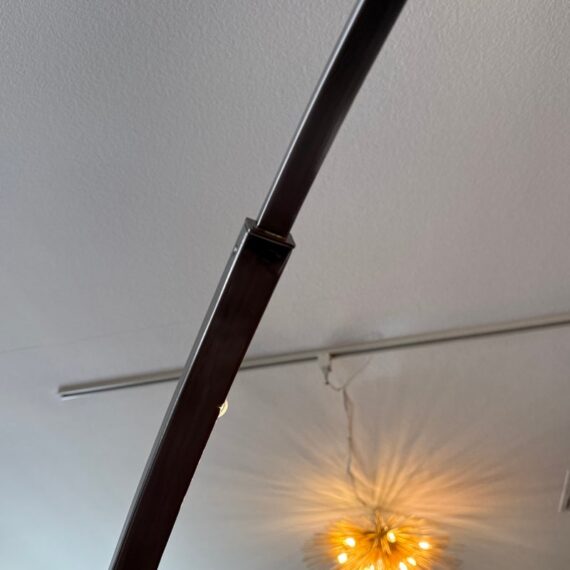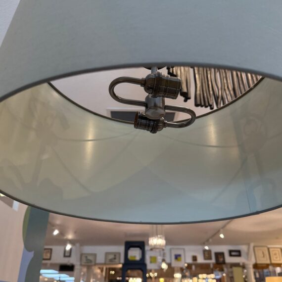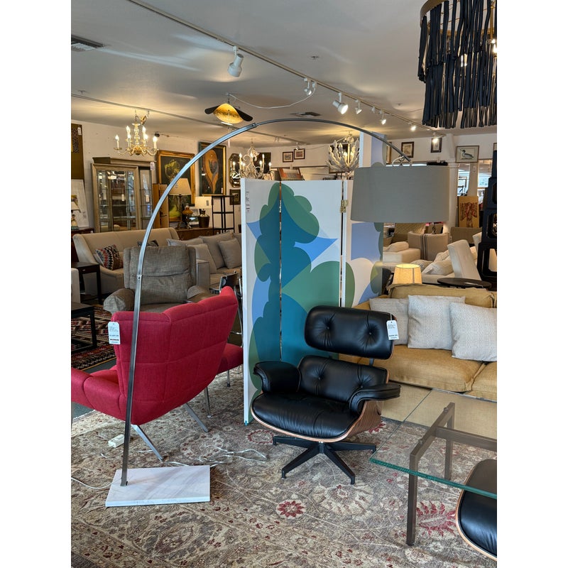 Design Plus Gallery present the Ari Arc Floor Lamp from Mitchell Gold + Bob Williams. The arc floor lamp has a marble like rectangular baseplate with a blackened silver metal arc connecting the base to the light source. The lamp shade has a drum shape in a taupe linen weave. This type of light is popular as it is a great space saver and brings overhead lighting without sacrificing floor space as you can slip the base under a bed or chair/sofa. The light fixture is missing some of its screws but otherwise it is in good overall condition.