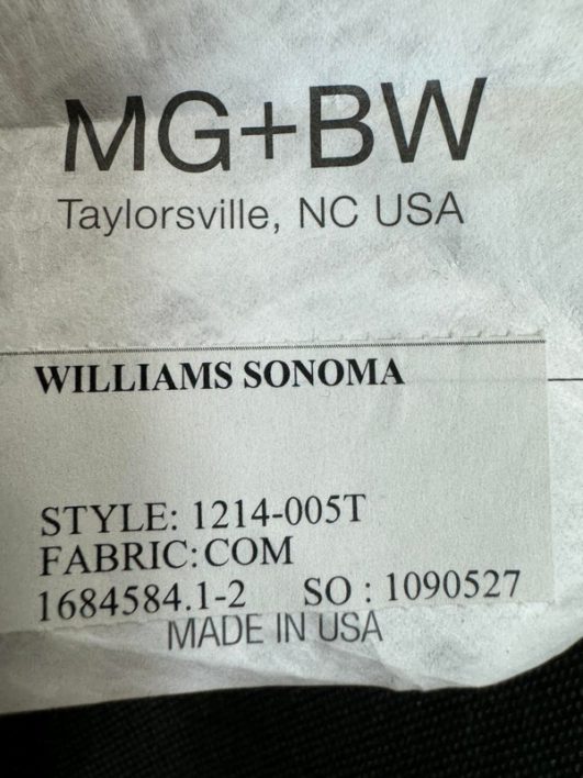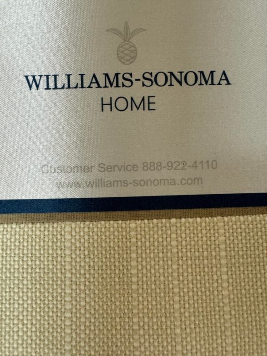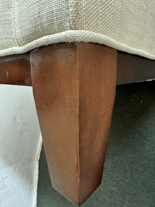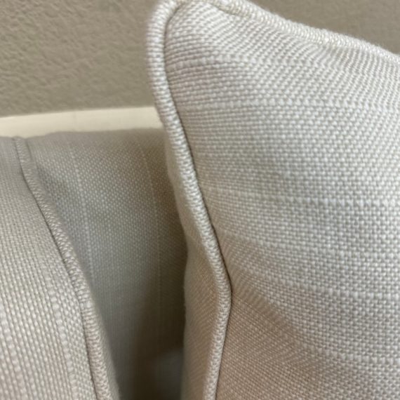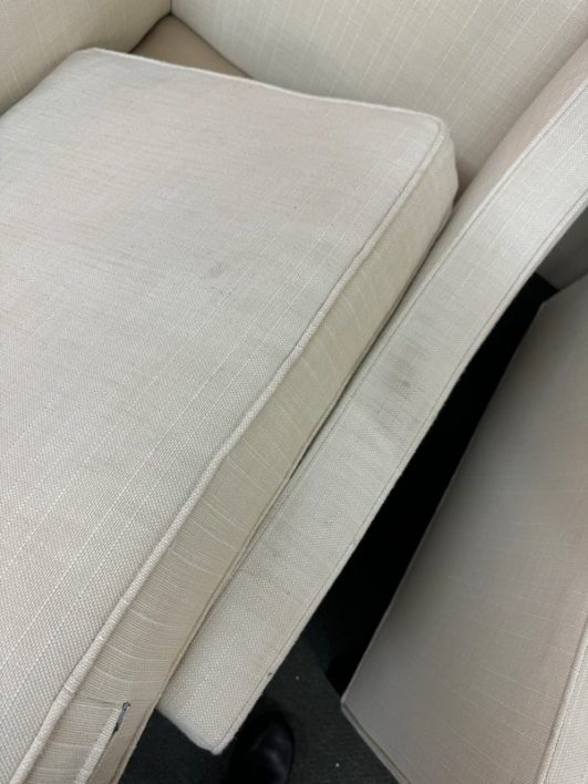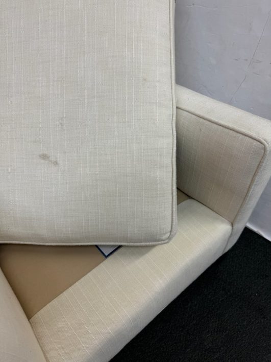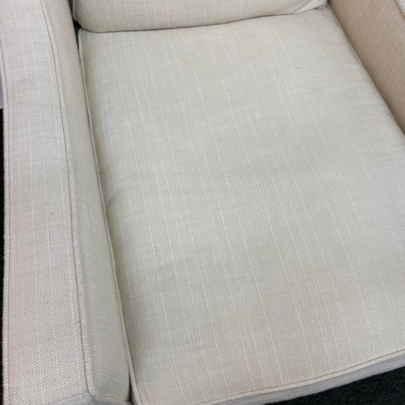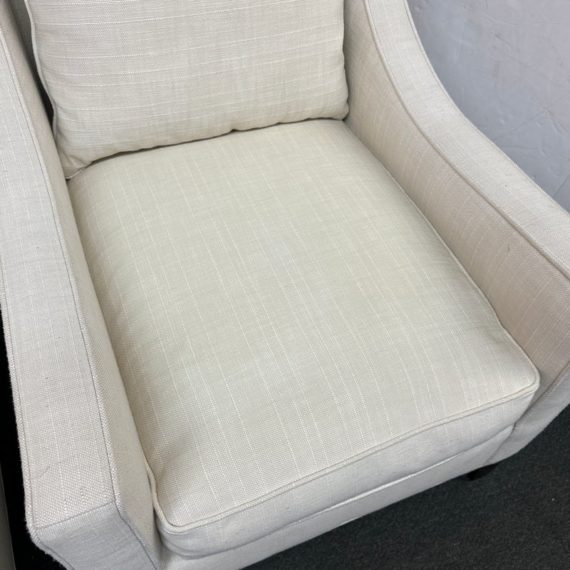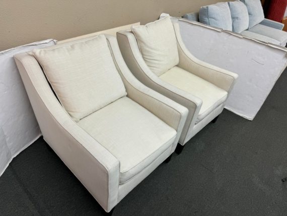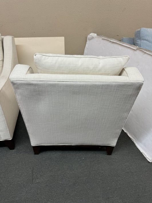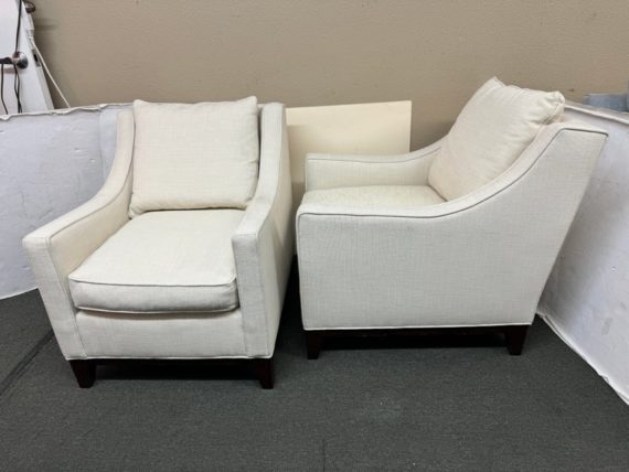 Design Plus Gallery presents a Pair of Sloped Arm Lounge Chairs Designed by Mitchell Gold + Bob Williams for Williams-Sonoma Home. Both are completely linen weave wrapped in a light ivory tone with separate back and seat cushions. They are in nice condition with minimal signs of wear from age + use. Made in the USA.