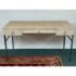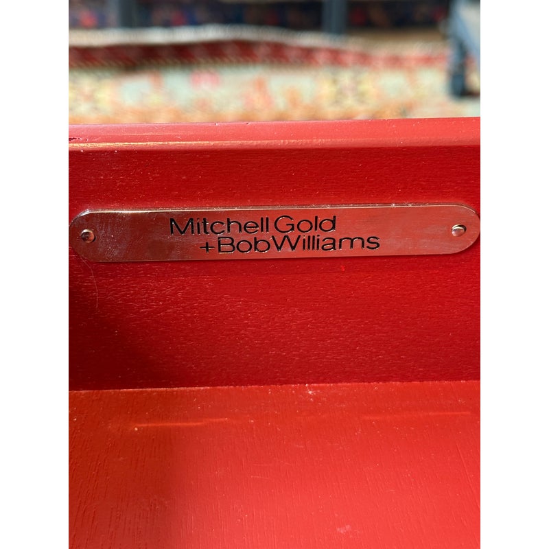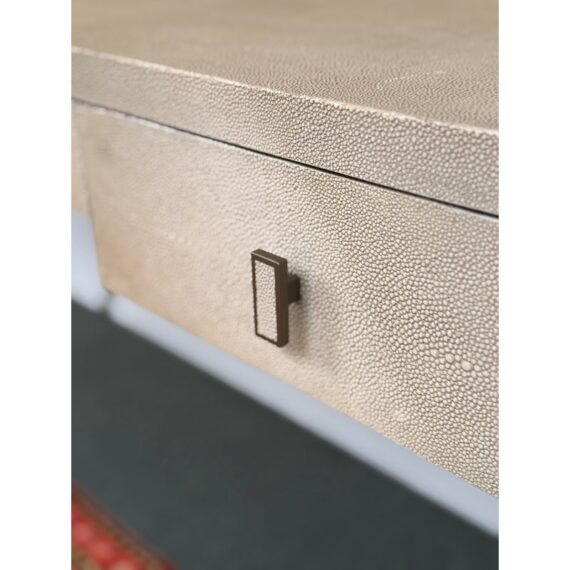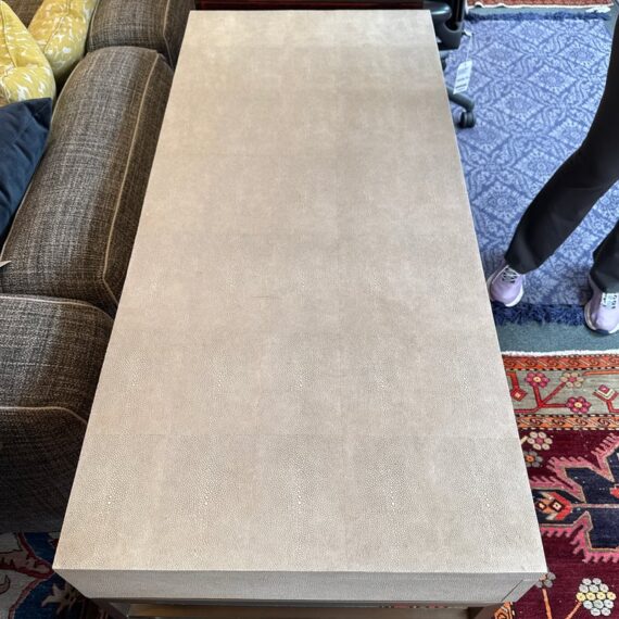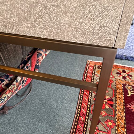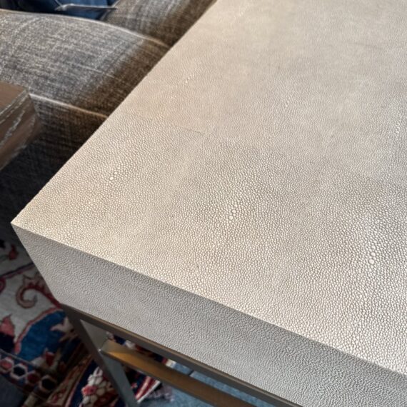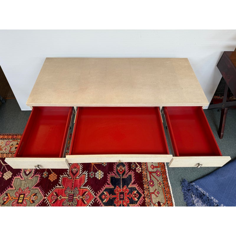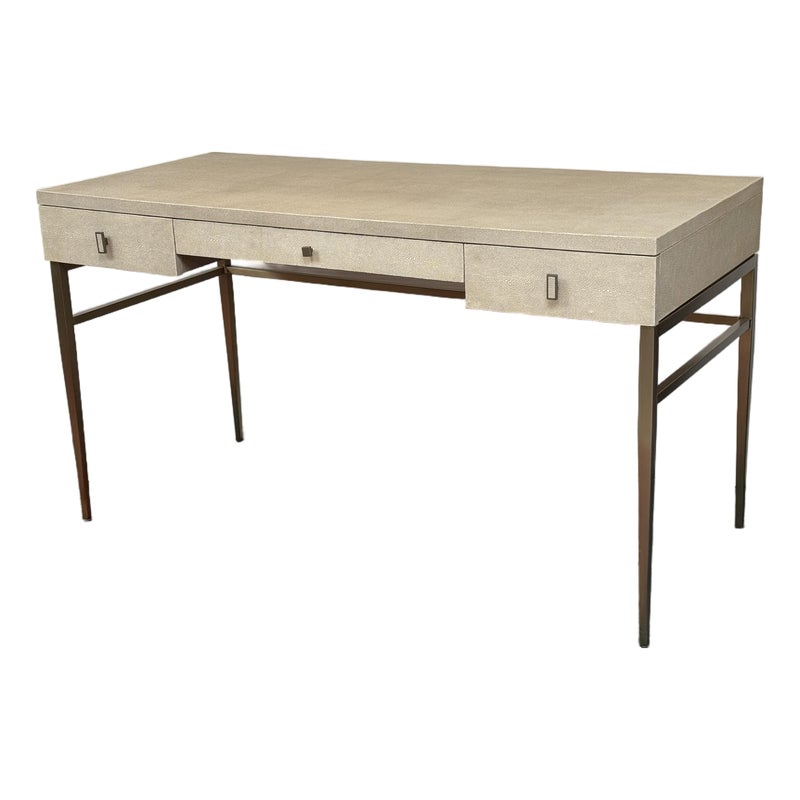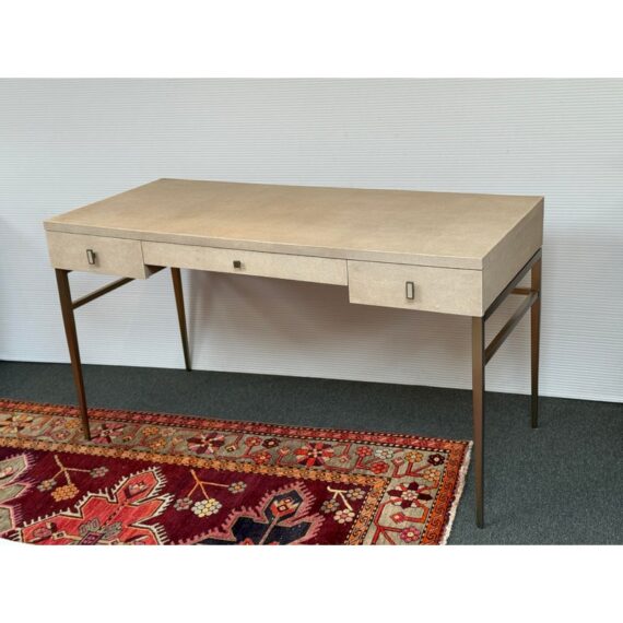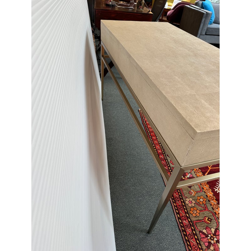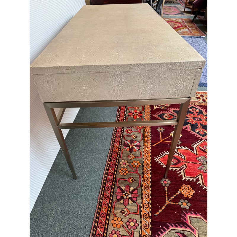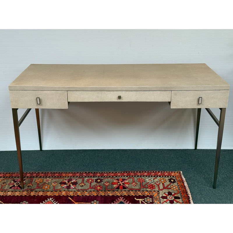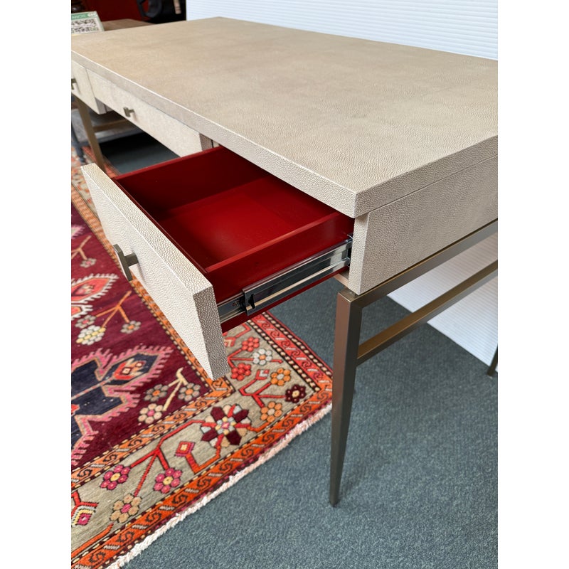 Design Plus Gallery presents the Solange Desk from Mitchell Gold + Bob Williams. This chic desk in faux shagreen echoes the glamour of Hollywood Regency in a modern way. The luxe finish is cast in resin from an impression of pebbled leather made from stingray skins. Applied in a repeating pattern, it achieves the classic texture with increased durability. This versatile piece is designed to bring elegance to many spaces, from home offices to living rooms and bedrooms. It also makes a beautiful vanity. The desk is in their cream finish with champagne-brass base/drawer pulls. There are three drawers with a single shallow drawer and two side drawers, all with red interiors. Light surface wear; condition is good for age and use.