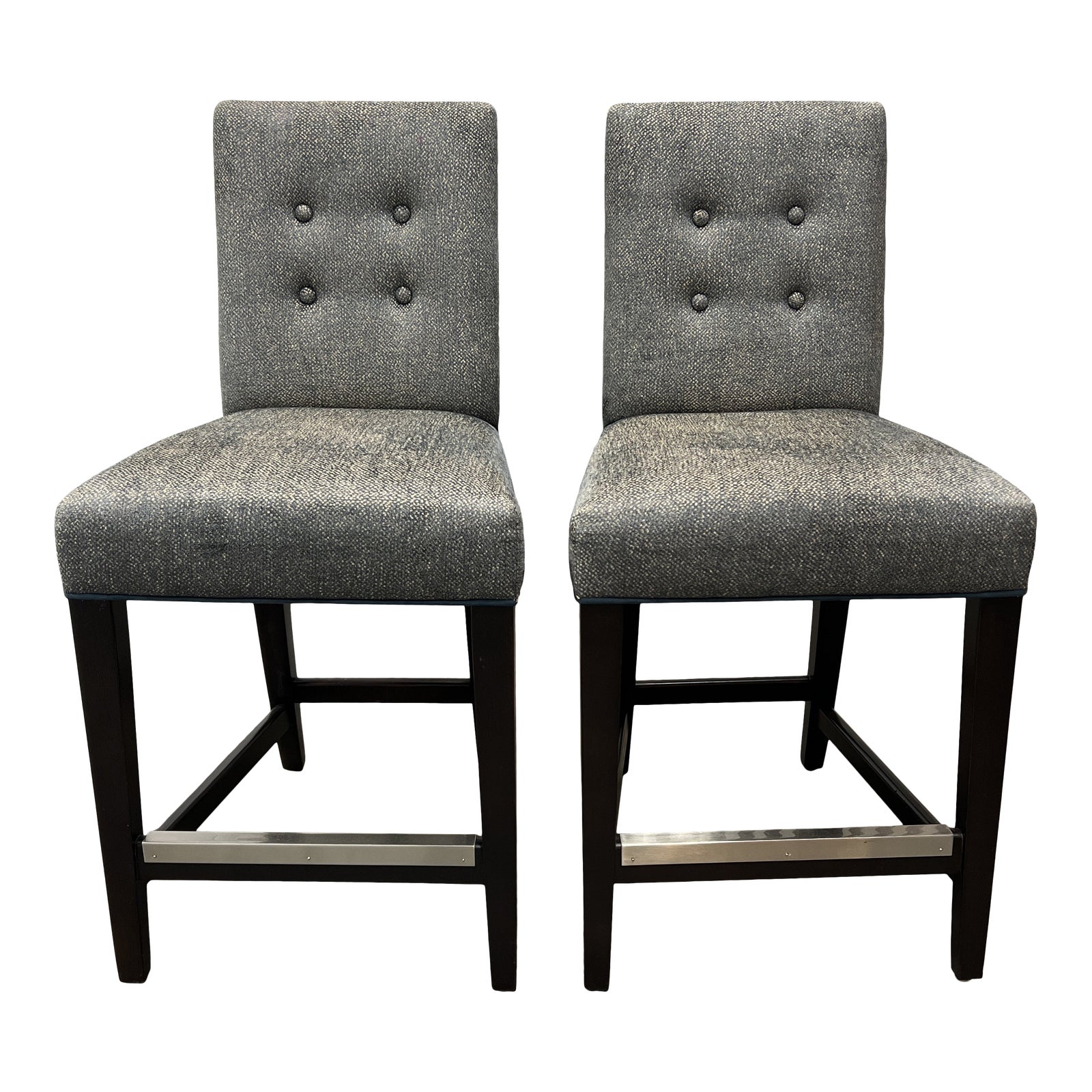 Design Plus Gallery presents a pair of Mitchell Gold + Bob Williams Wood + Fabric Parsons Style Counter Stools. These counter stool combine clean-lined Parsons styling with a classic buttoned back for a timeless look with the extraordinary comfort only upholstered seating can give. A perfect compliment to both modern and traditional decors. These stools have a slightly shimmery navy and beige tweed fabric that appears grey from a distance. The backs of the chairs are upholstered in navy velvet. The base of the chair is in a dark wood finish. Good condition, minor wear from age.