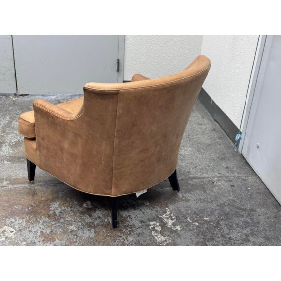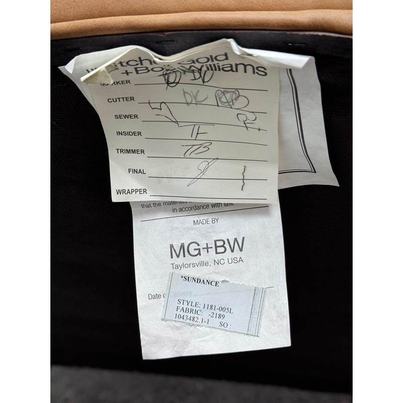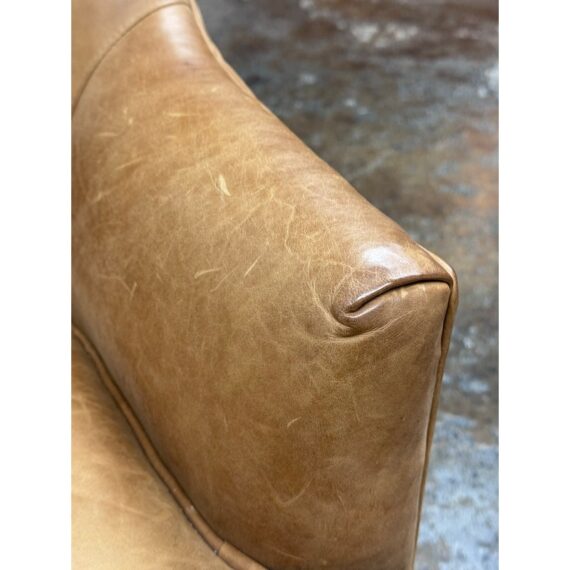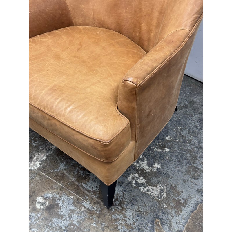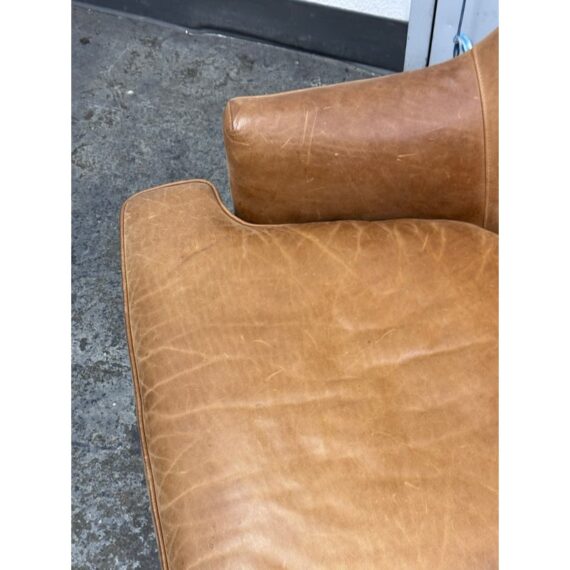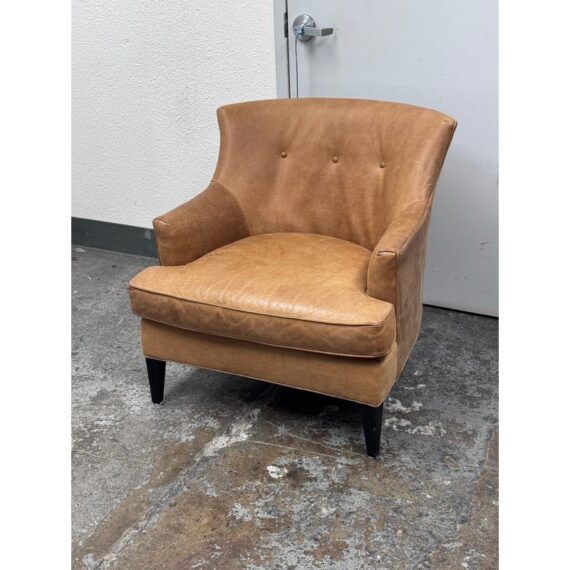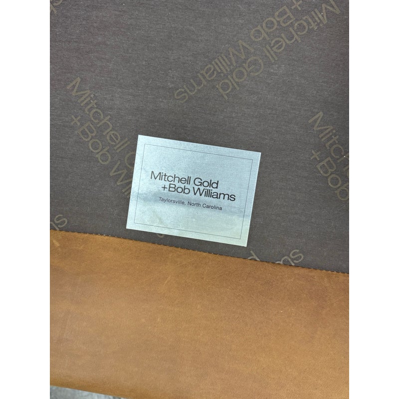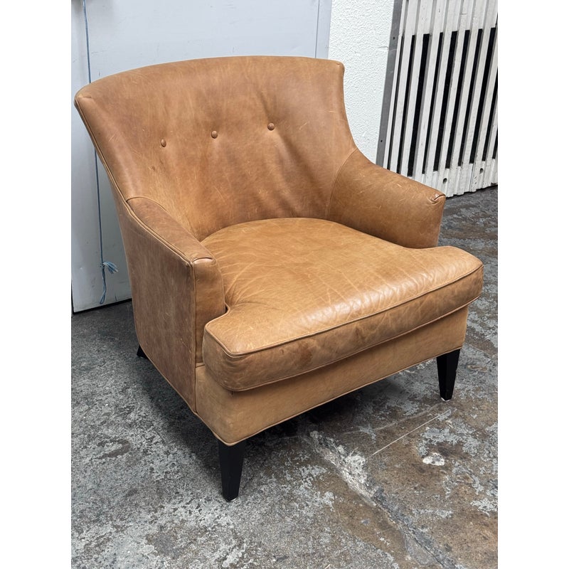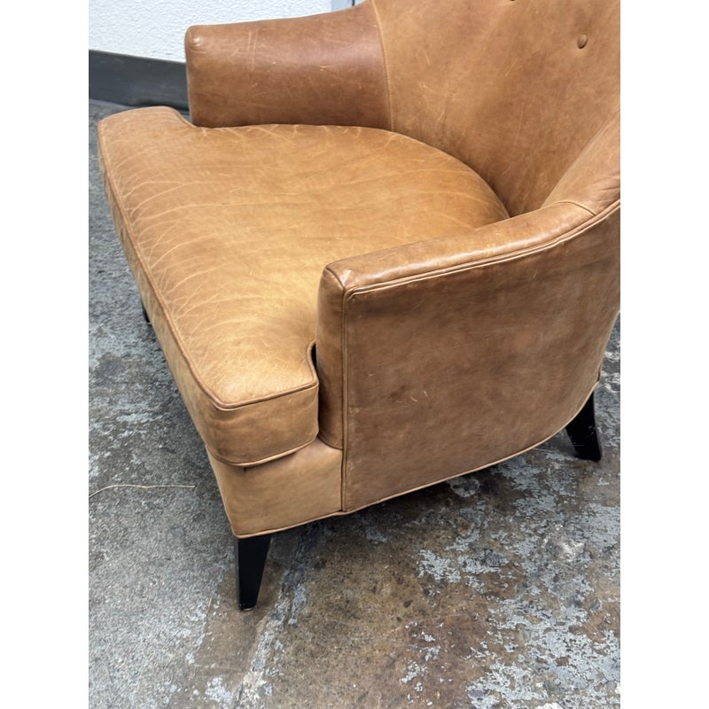Design Plus Gallery presents the Wyatt Lounge Chairs from Mitchell Gold + Bob Williams. The chair has a nice sloped arm metal with soft button tufting, a single row with an all brown leather zipper upholstery wrap. There is a single loose cushion. There is visible wear and distress to the leather that is naturally occurring and present. Condition is fair overall. Made in the USA.