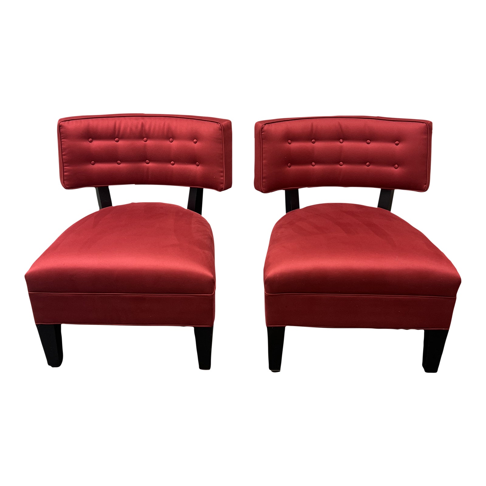 Design Plus Gallery presents a Pair of Mitchell Gold Button Tufted Klismos Chairs. The frame is constructed with wood and given a black finish. The legs are square with a taper; the back legs have a cabriole style curve. The chair’s seat and back are upholstered in a synthetic red polyester. The back is curved and features ten button tufts. Lightly worn. Minor wear from use; chairs are in good condition. Made in Taylorsville, North Carolina, USA.