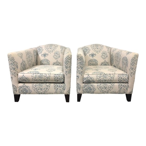 Design Plus Gallery presents a pair of Celia Chairs from Mitchell Gold + Bob Williams. Upholstered in a brushstroke printed linen-like fabric, the arch backed arm chairs offer a comfortable hug. Tapered dark legs legs are minimally elegant .Arms are gently arched for comfort and are echoed by the shape of the back. The tight back is pitched at a comfortable angle while the loose seat cushion is supportive.