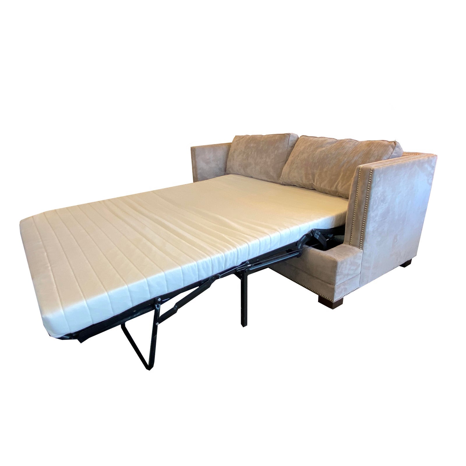 Design Plus Consignment Gallery presents the Keaton Sofa by Mitchell Gold. The style is simply modern and oh so comfortable with down and feather back cushions and foam seat cushions. The sleek shelter styling is accentuated with silver nailhead trim on the base and arms. Construction features an eco-friendly hardwood frame, rigid sheet webbing in back and removable legs. Made in the USA
