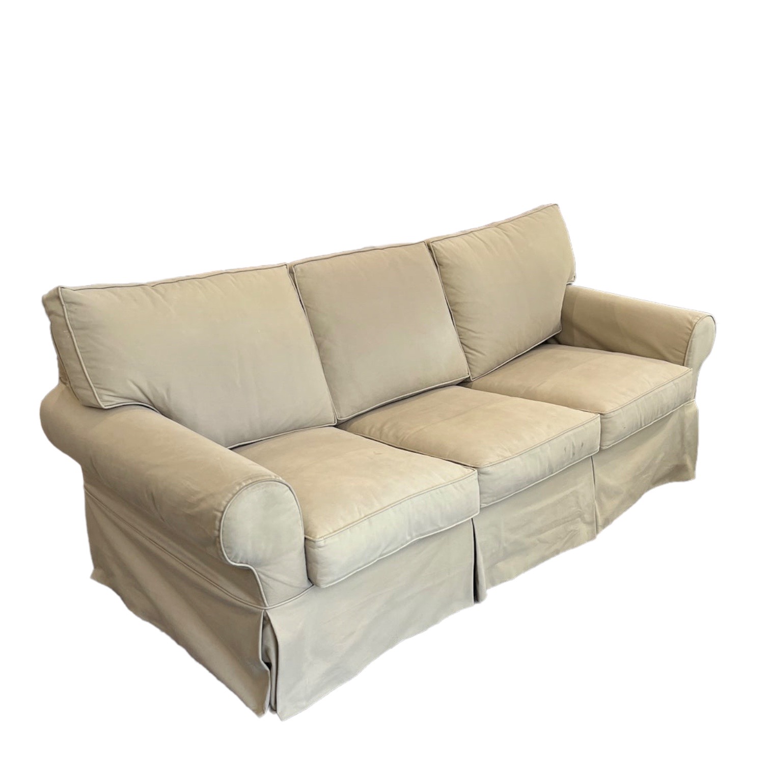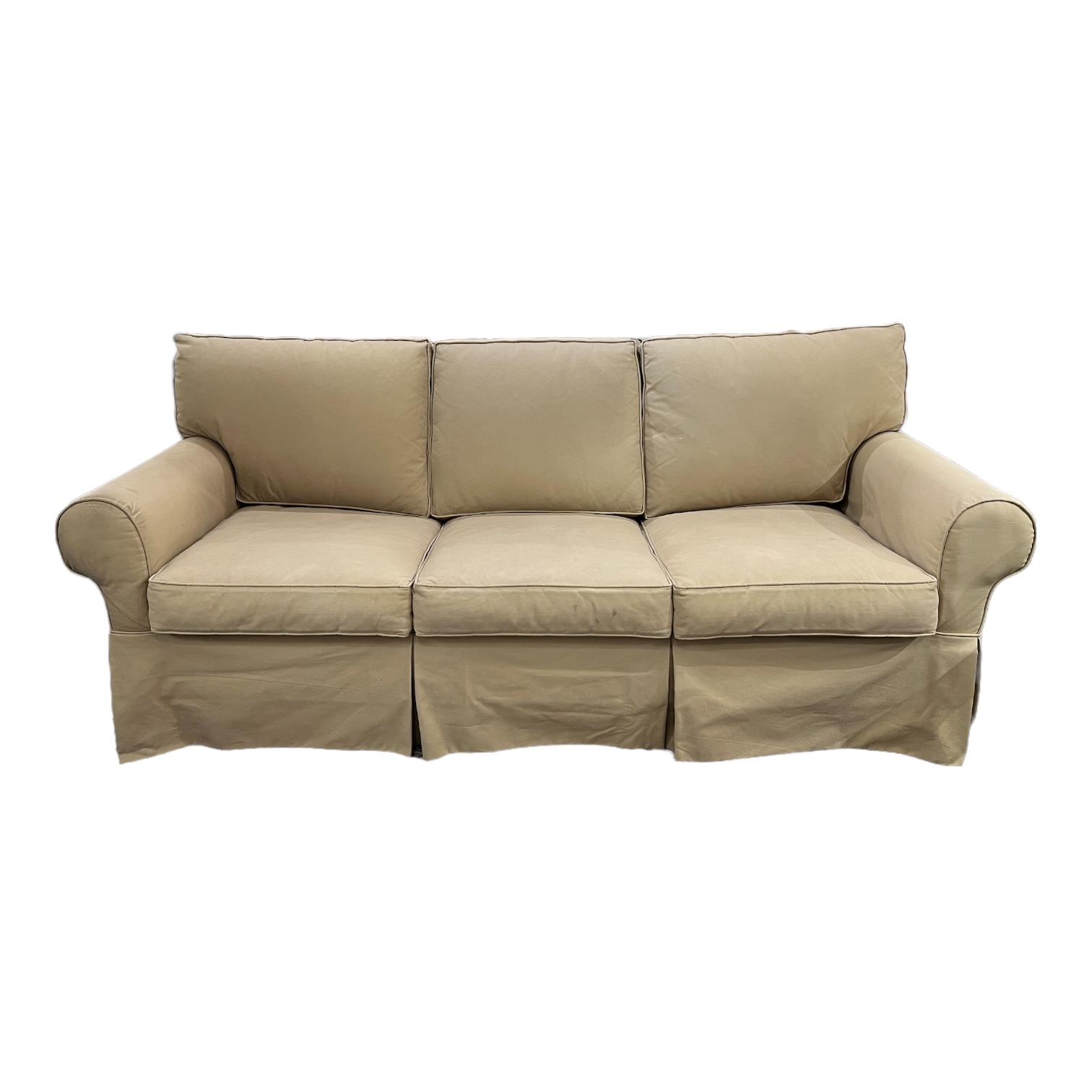 Design Plus Gallery presents a Khaki Slipcover Sleeper Sofa by Mitchell Gold. Traditional Roll arms with self welting, the slipcover has significant wear/cleaning spots. Queen mattress is clean.