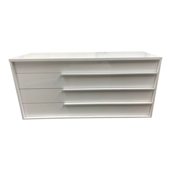 Design Plus Gallery presents a Modani White Gloss Lea 4 Drawer Dresser. With its classic design and modern minimalist flair, the Ana Dresser in White will never go out of style! Each surface of this dignified dresser is arranged with straight lines and right angles, creating a pure and simplified look. Minor wear on surfaces. Four large drawers enable you to stow away prized possessions in an organized fashion.